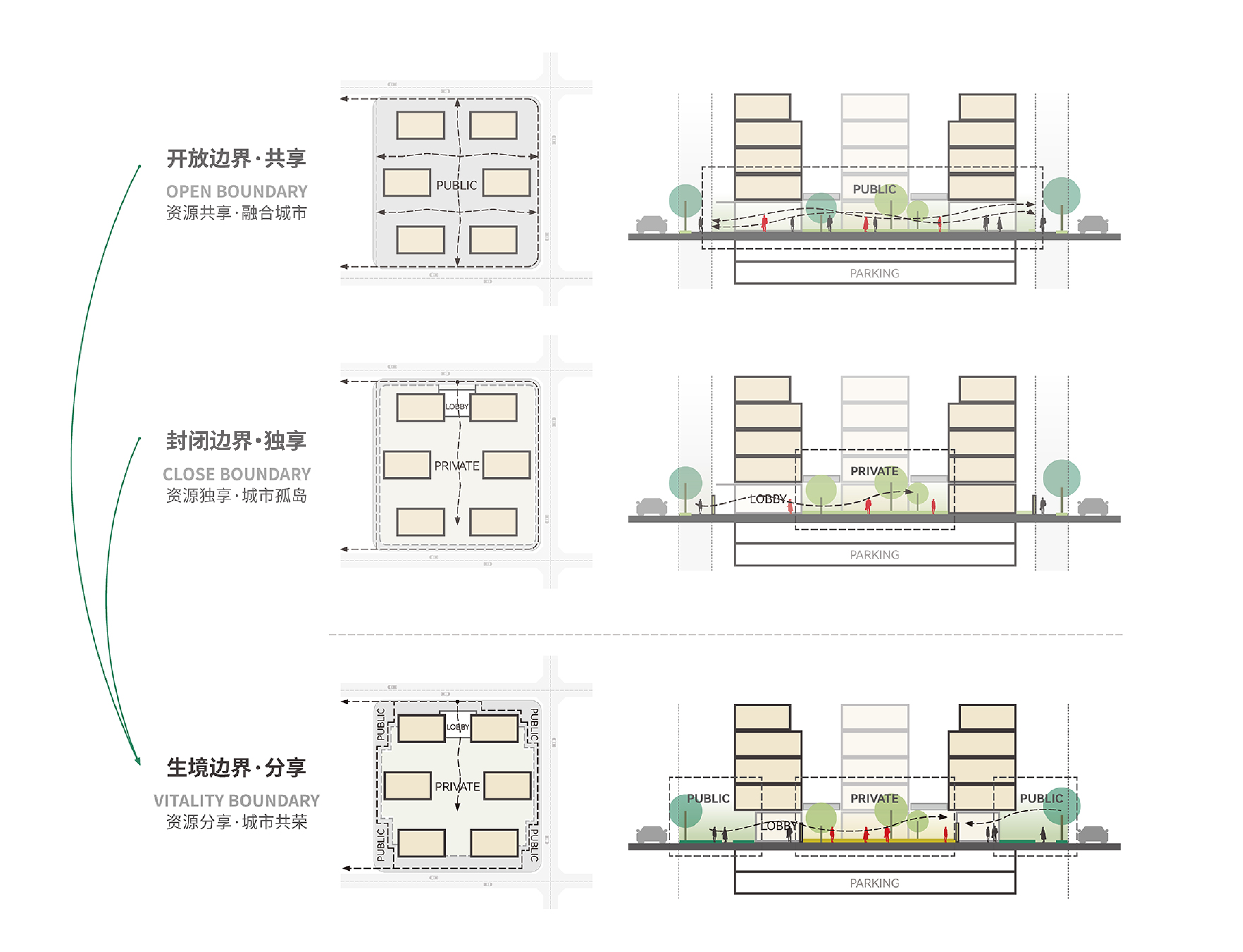 在功能组织的关系处理中,私密性与公共性之间的平衡是项目设计面临的另一大挑战。对此,我们规划了一种多层级开放空间体系,以营造项目特有的公共性特质。