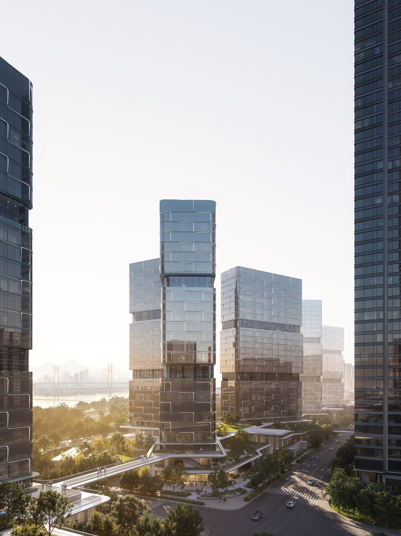 建筑整体延续了竞赛阶段提出的群像式“长江画屏”概念,单体也保持垂直方向的体量三段划分关系。8座板式塔楼采用体块分段和前后推拉的形式,形成退台,拓展室外露台空间,优化横向尺度,强化建筑与江面在形态上的呼应,塑造灵动而富有韵律的天际线形象。