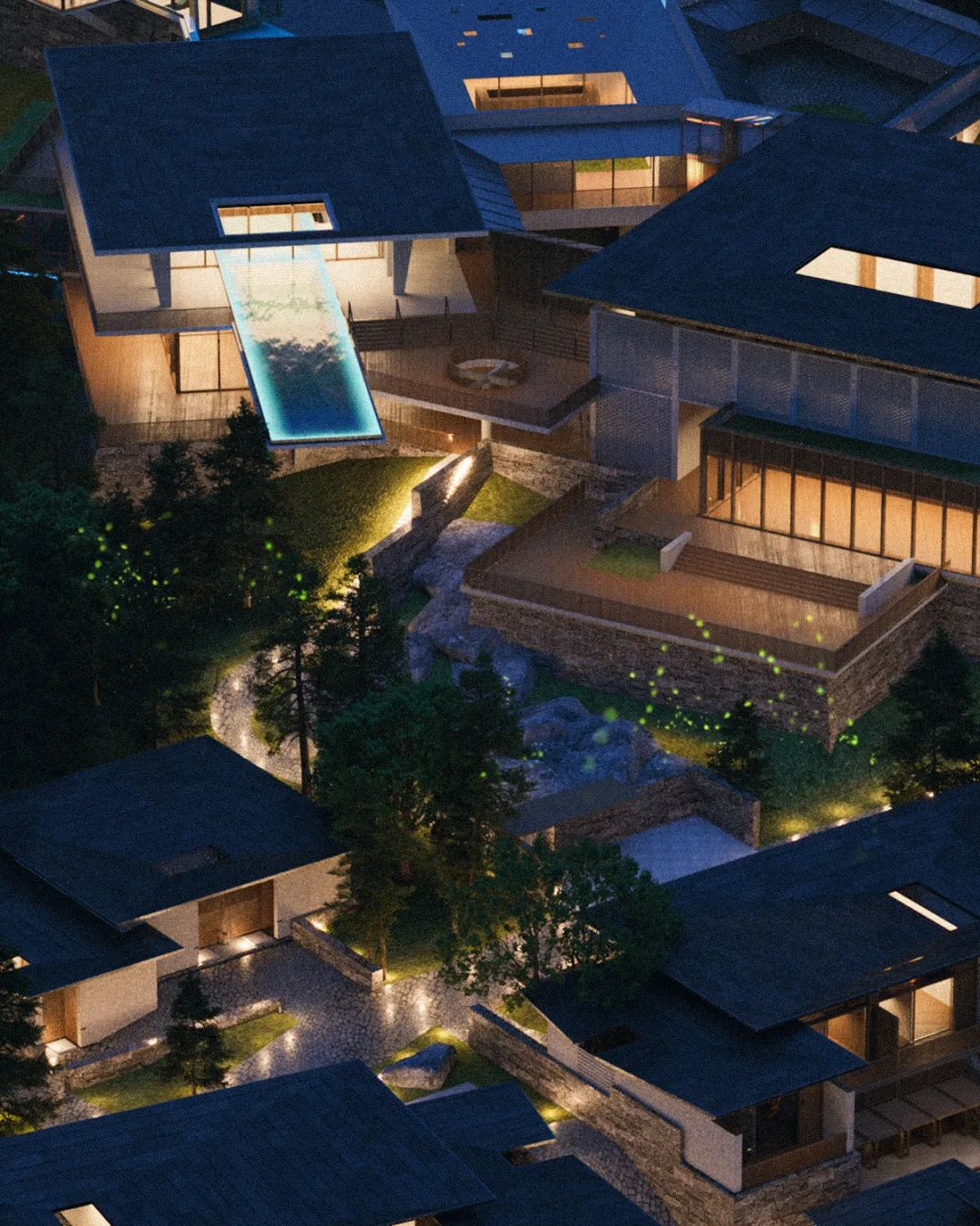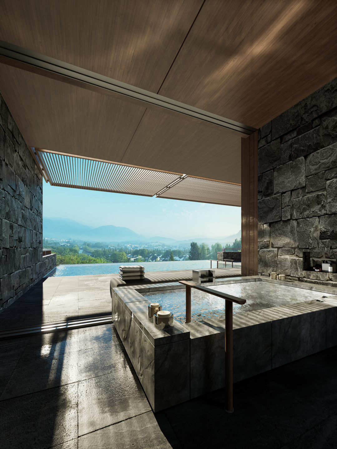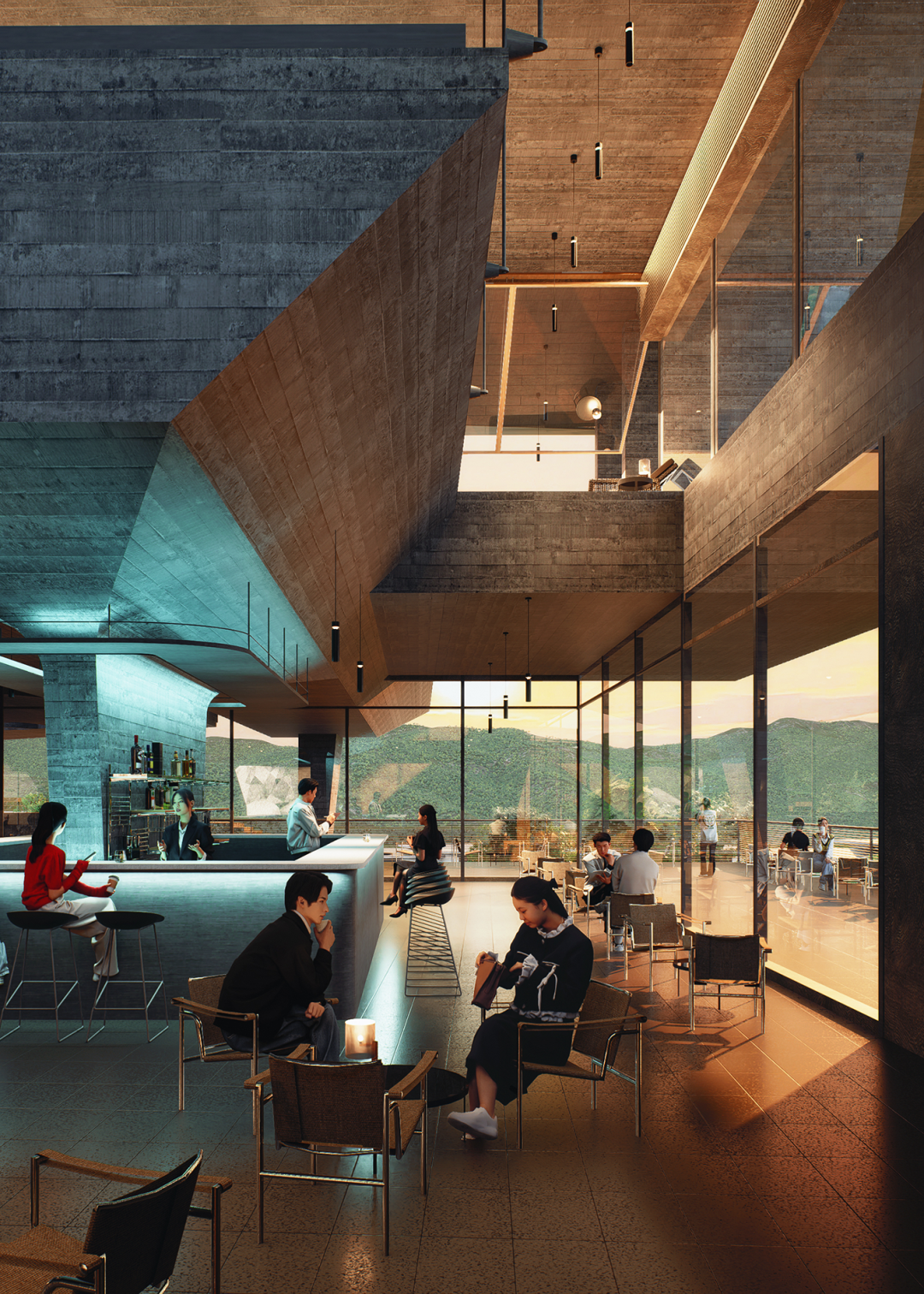 公区组团以峡谷景观为轴线,并就此设置落客和入口接待。向东是外向型景观的高台地,布置餐饮、宴会等聚集性活动空间。