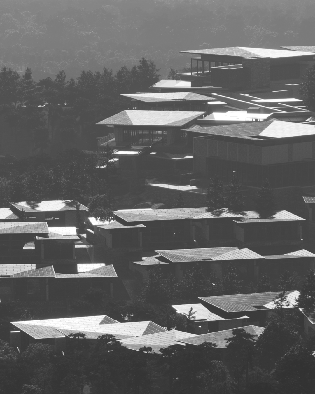 客房组团的布局,沿道路两旁线性排布。依据地势和视线分析,在坡地地形,以高点沿坡地向下,层层布置,保证每层高度上的客房享有无遮挡的景观视野;谷地地形,则通过控制两侧客房间距,减少对视。