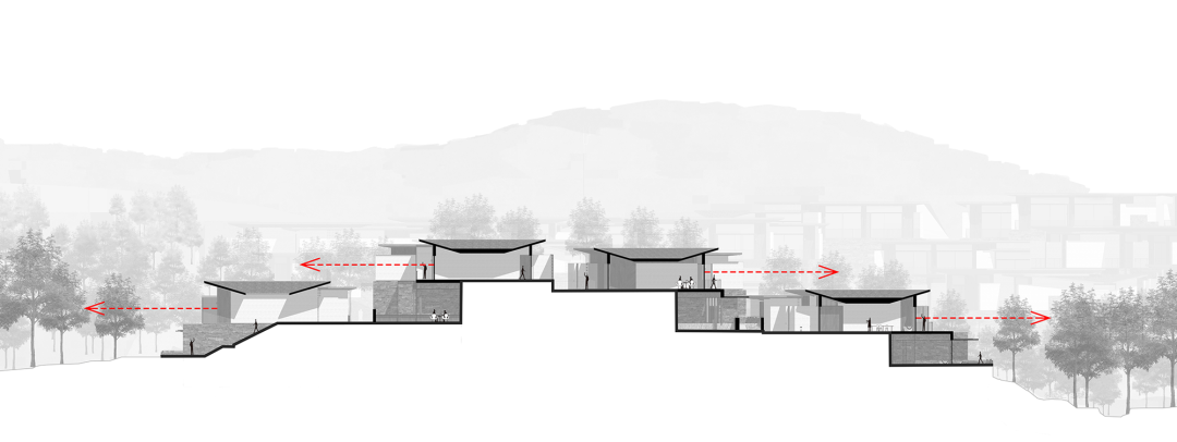 经由连廊和片墙的组织,形成了更多的户外观景台和更连通的路径,回应徽州传统聚落中起承转合、收放有致的街巷经验。
