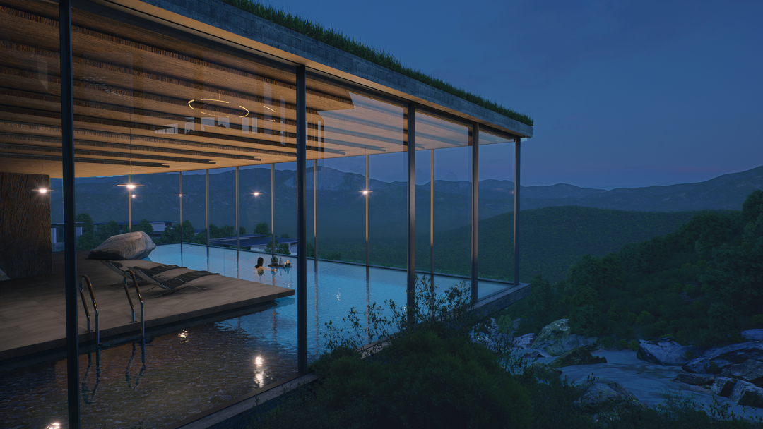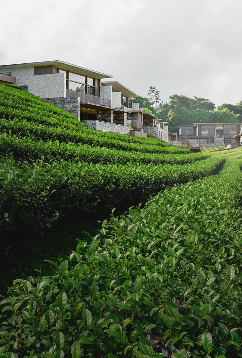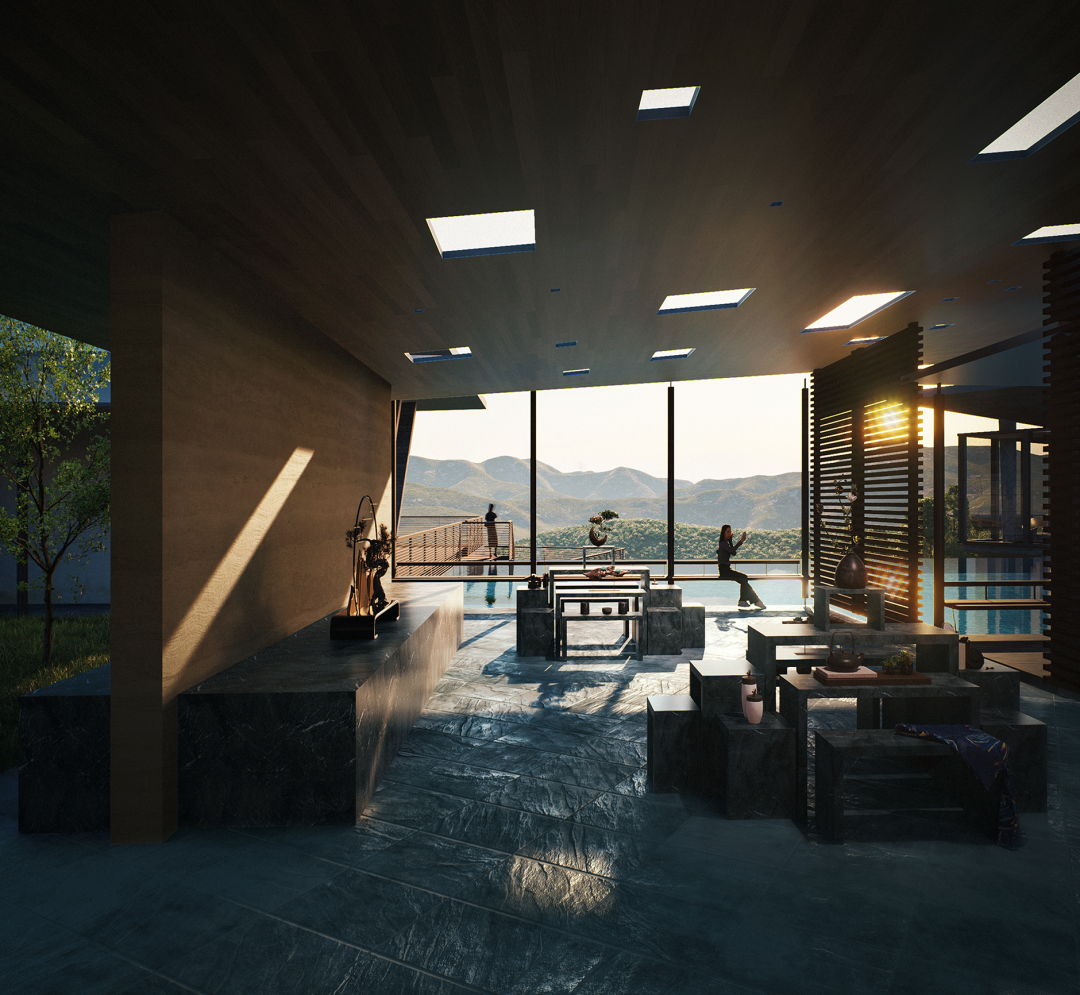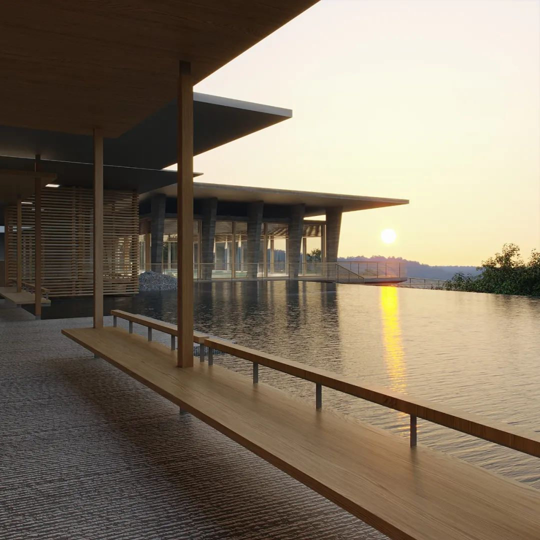 其中,餐饮是金普顿酒店最具特色的服务,我们将其设置在相对独立、视野最佳的东侧端头。向西则是相对内敛的缓坡台,用于小规模的康养休闲。