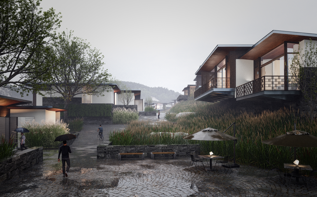东侧高地,视野开阔,可观日出,属于外向型景观;向北远眺,是连绵山脉的全景和古朴村落的近景,自然和人文景致兼备。西侧峡谷,呈内敛趋势,整体氛围幽深静谧,保留有大量的高杆杨树。因此,自东向西,顺应地势,依次布置公区组团和客房组团,逐渐过渡。