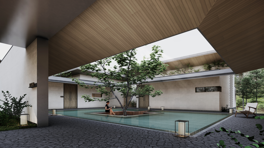 而屋面以下,则通过天井庭院的形体变化,来解决内与外、公共与私密的空间过渡,以及单一与多变的场景需求。