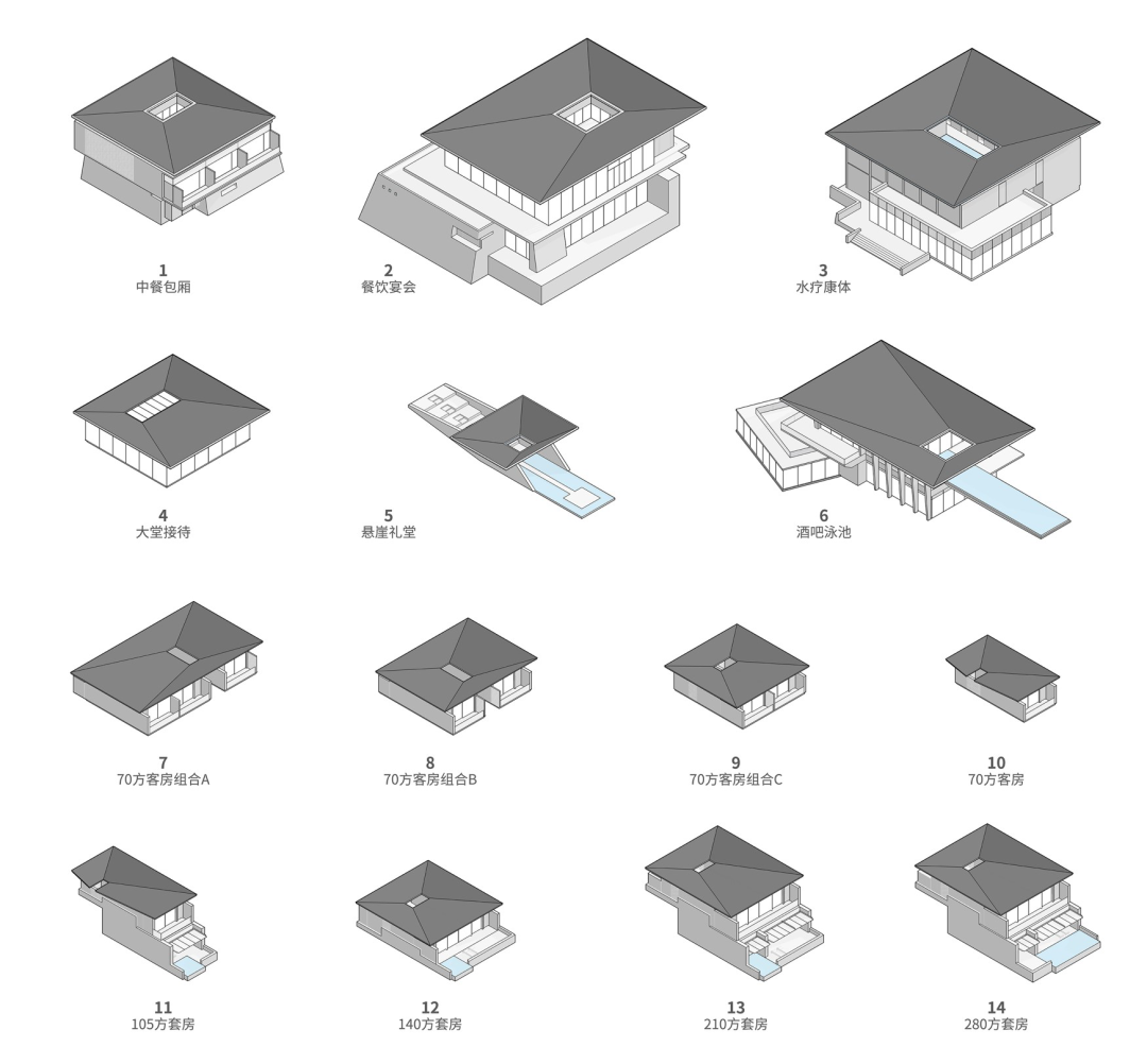传统徽派民居多采用大进深、小天井的空间格局。我们以此为原型单元,将天井设置于一侧,两个客房体块对称拼接时,天井空间将增大一倍,或形成不同尺度的院落,既解决了采光通风,也实现了高效用地。2种户型拼接,或利用地势形成3种户型的上下拼挂,共形成4种客房组团。