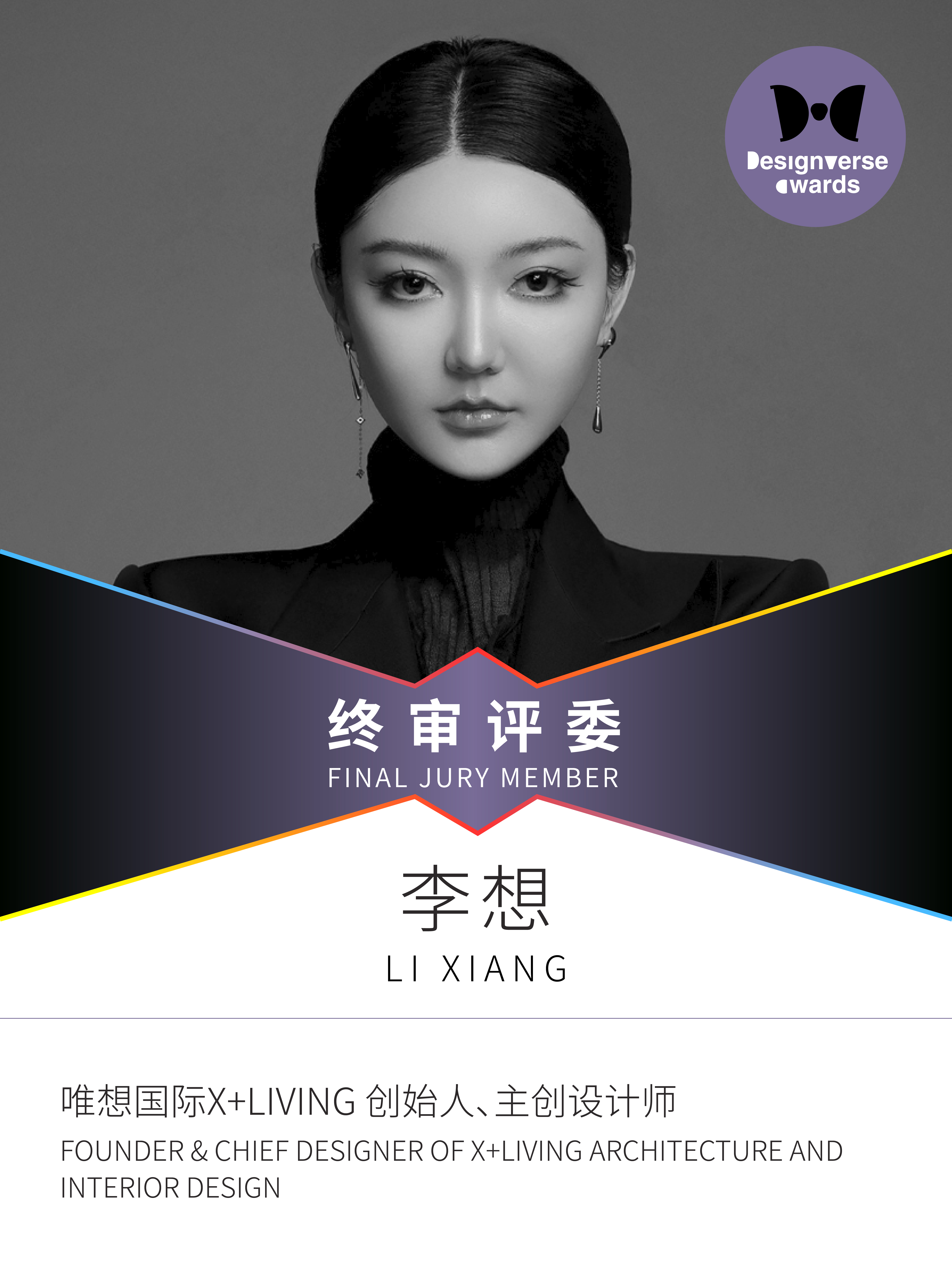 Li Xiang, Founder & Chief Designer of X+Living Architecture and Interior Design. Shefounded X+Living Architecture and Interior Design in 2011, has created representative and outstanding design works across diverse business formats such as commercial real estate, culture, retail, family entertainment and hospitality. She leverages her distinctive insights into art and culture to construct commercial spaces teeming with emotional tension, crafting sensory escape points for the general publicand infusing the brands she serves with design creativity that confers a competitive edge. Her work has been globally recognized with numerous accolades, garnering over a hundred design awards, and she has also been invited to serve as a judge for internationalcompetitions such asthe Dezeen Awards, Frame Awards, and A'Design Awards. She has been honored as Forbes's Designers with the Most Potential, German Iconic Design Award's Interior Designer of the Year, and Global Interior Retail Design Awards at the Prix VersaillesAwards.In 2020, she was the only Chinese designer selected by Fast Company in the "Most Creative People in Business". In 2021, she became the only Chinese designer listed in the PMI Future 50.