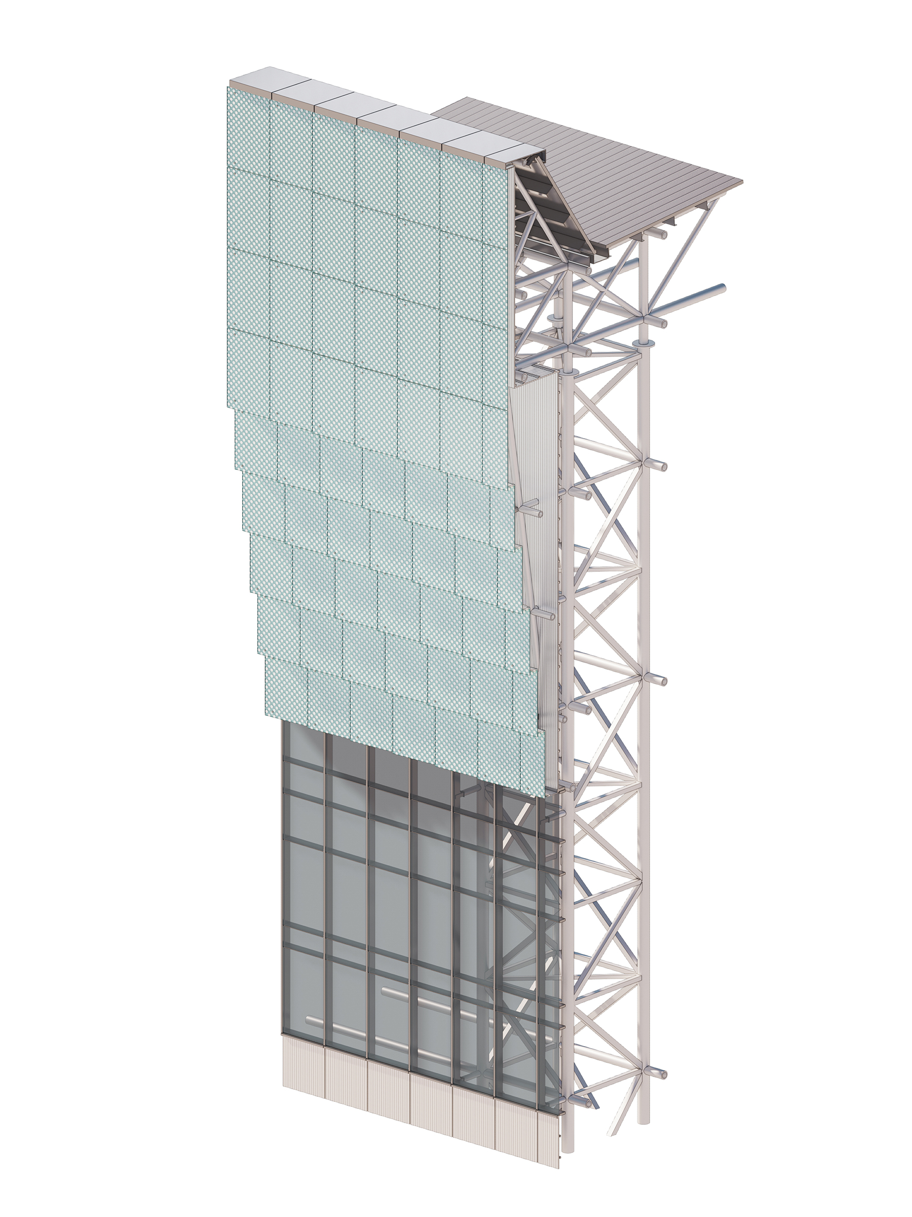 ‘帷幕’位于厂房上部,采用点式玻璃幕墙体系,由上至下包含6个叠退的层次,水平方向为鳞片式玻璃板块搭接,形成织物褶皱一般的肌理。‘鳞片’材质选用淡绿色釉面玻璃,表面镀有镜面点阵涂层,通过强反射与弱反射的叠加,将周边环境以‘丝网印刷’的质感映衬在建筑表皮上,形成迷幻的光影。
