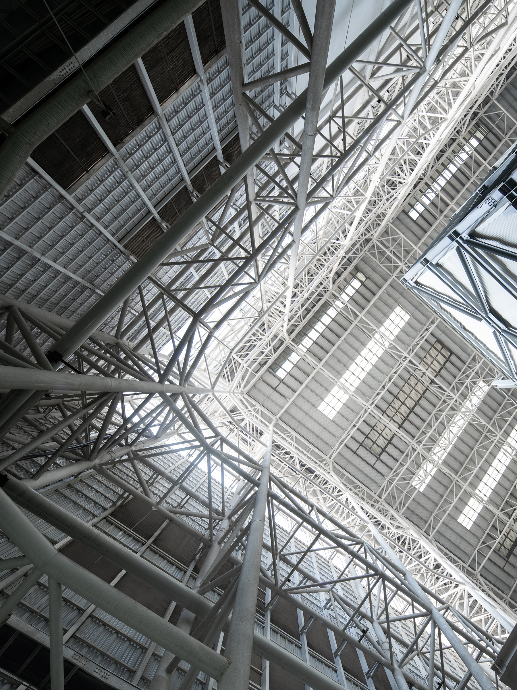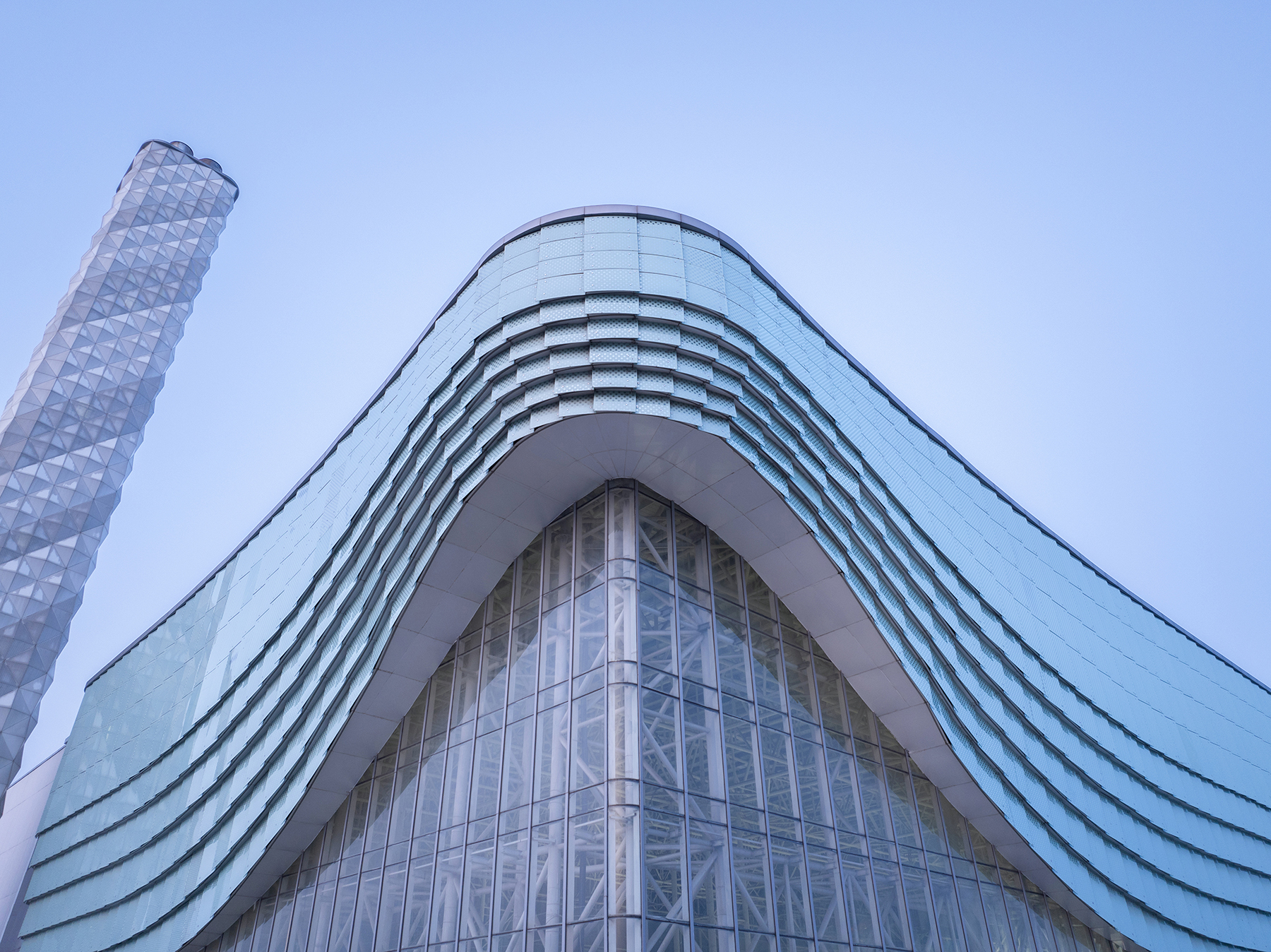 烟囱高度110余米,是整个厂区的制高点。其表皮采用四棱锥形的铝板单元,并通过局部穿孔的方式,形成螺旋上升的线条,似乎具备了一种神圣的纪念性。