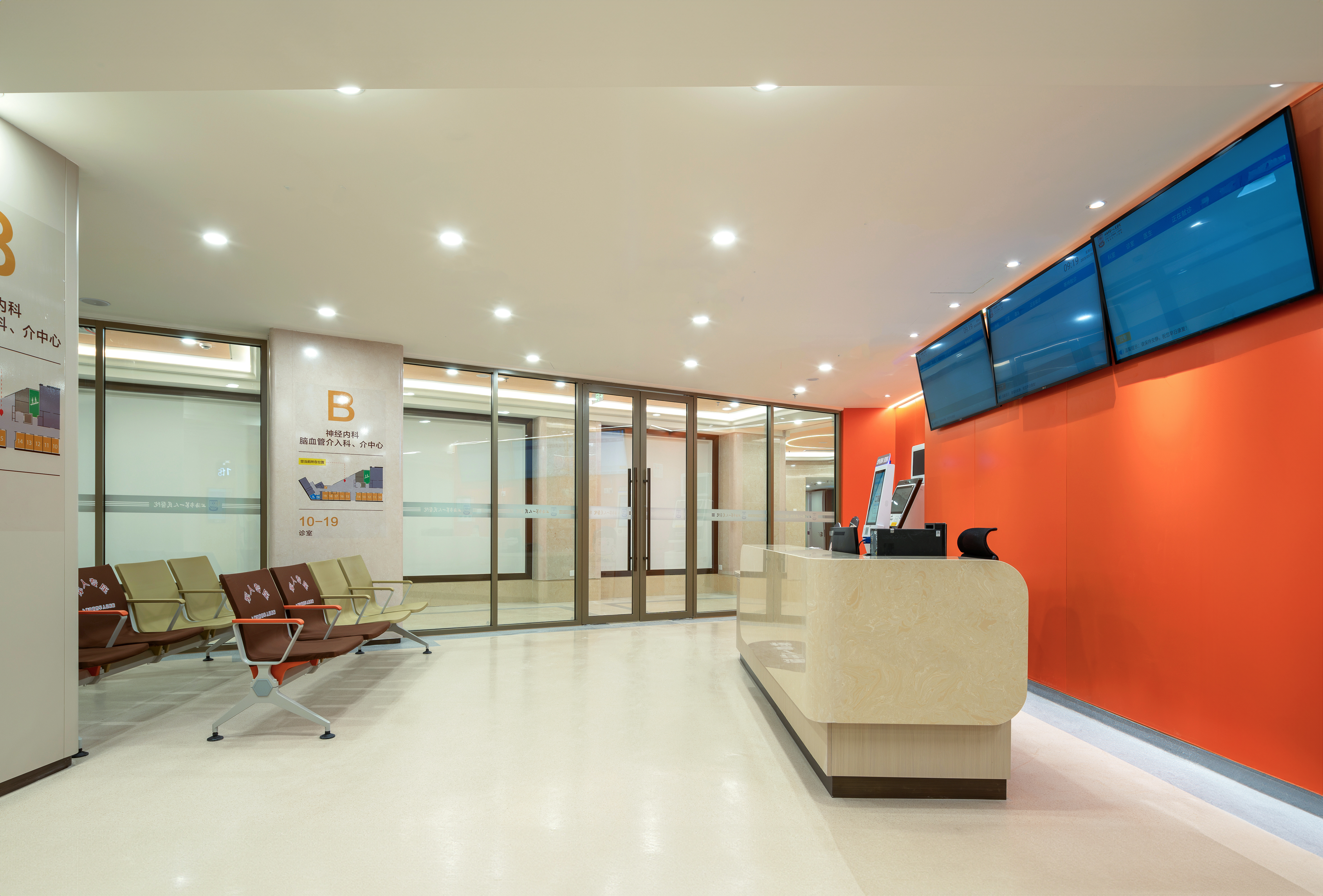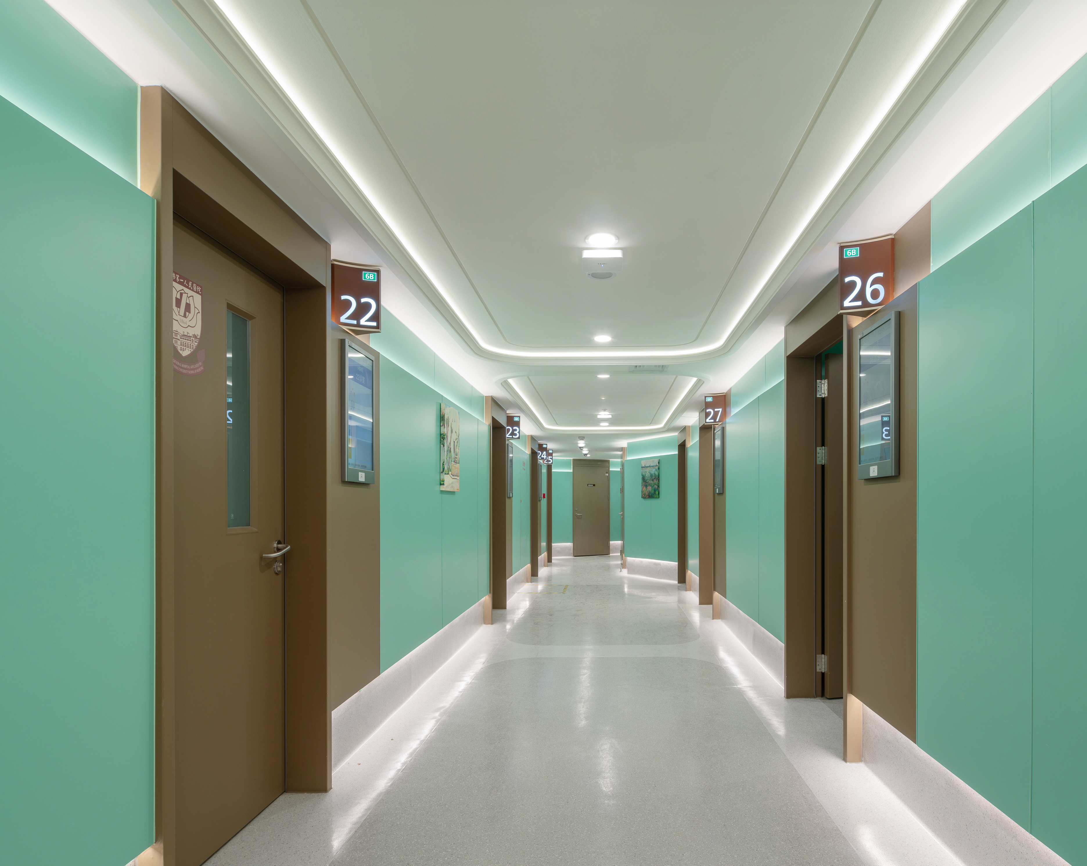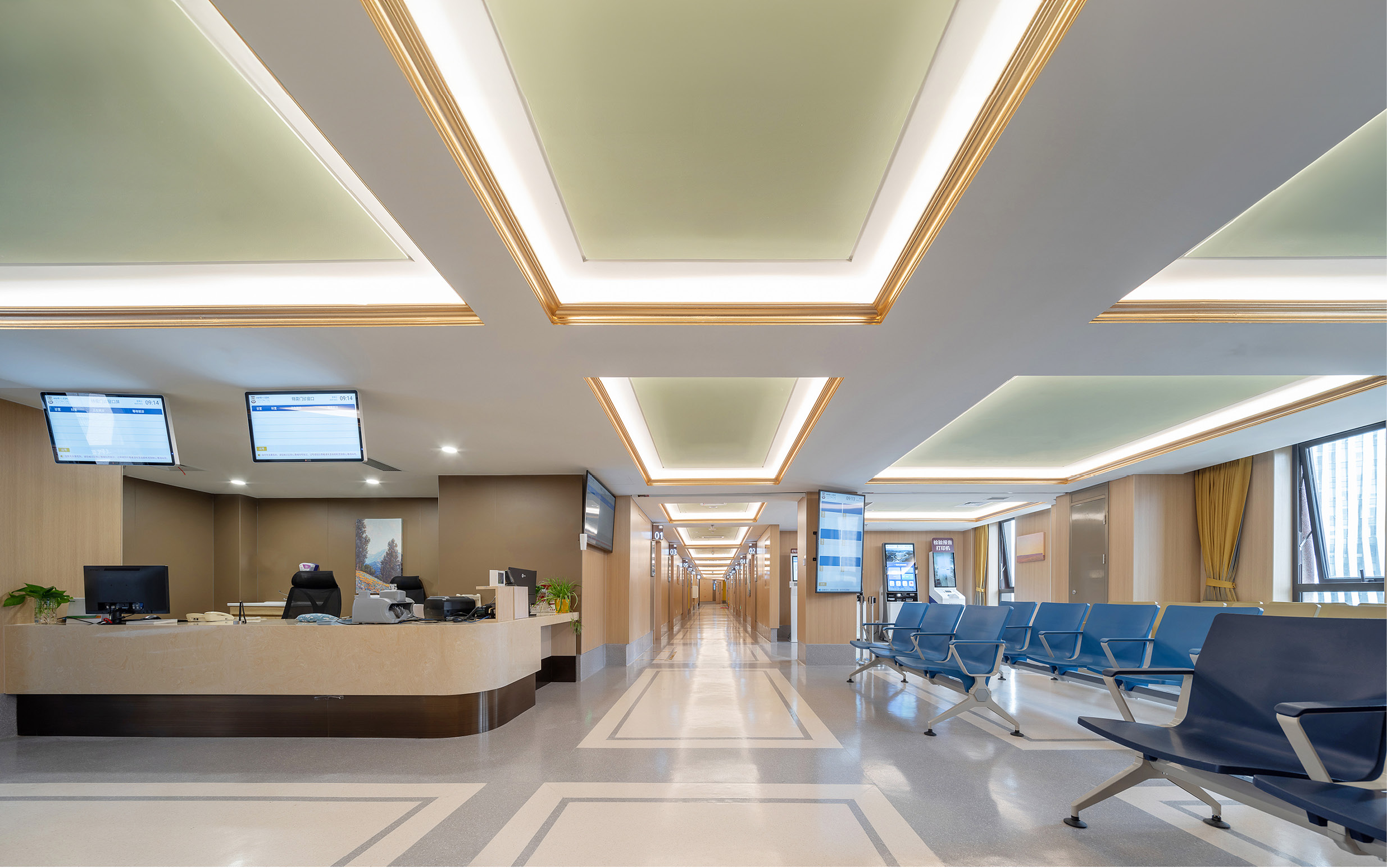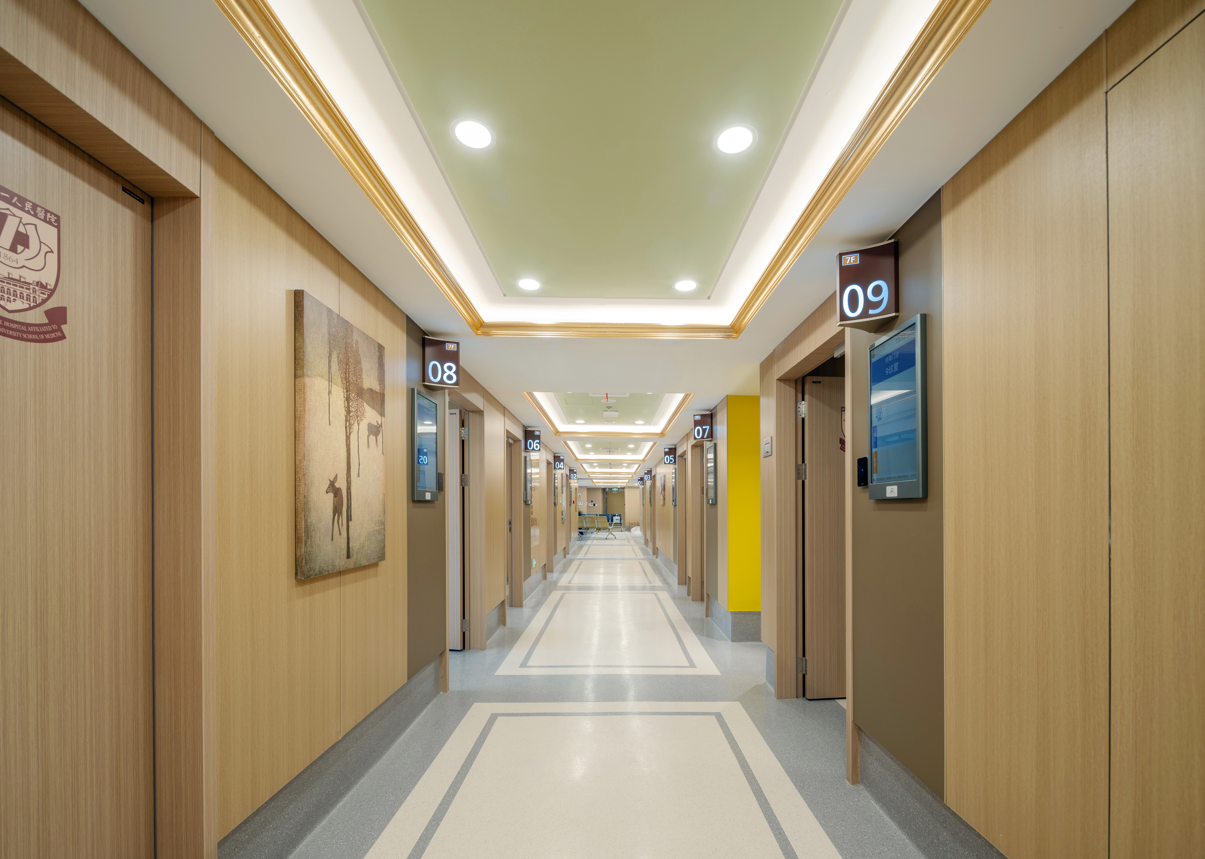 医院院徽巧妙融入门诊公共区域墙面,文化符号化作具象的建筑细部,让诊疗空间更具人文温度。