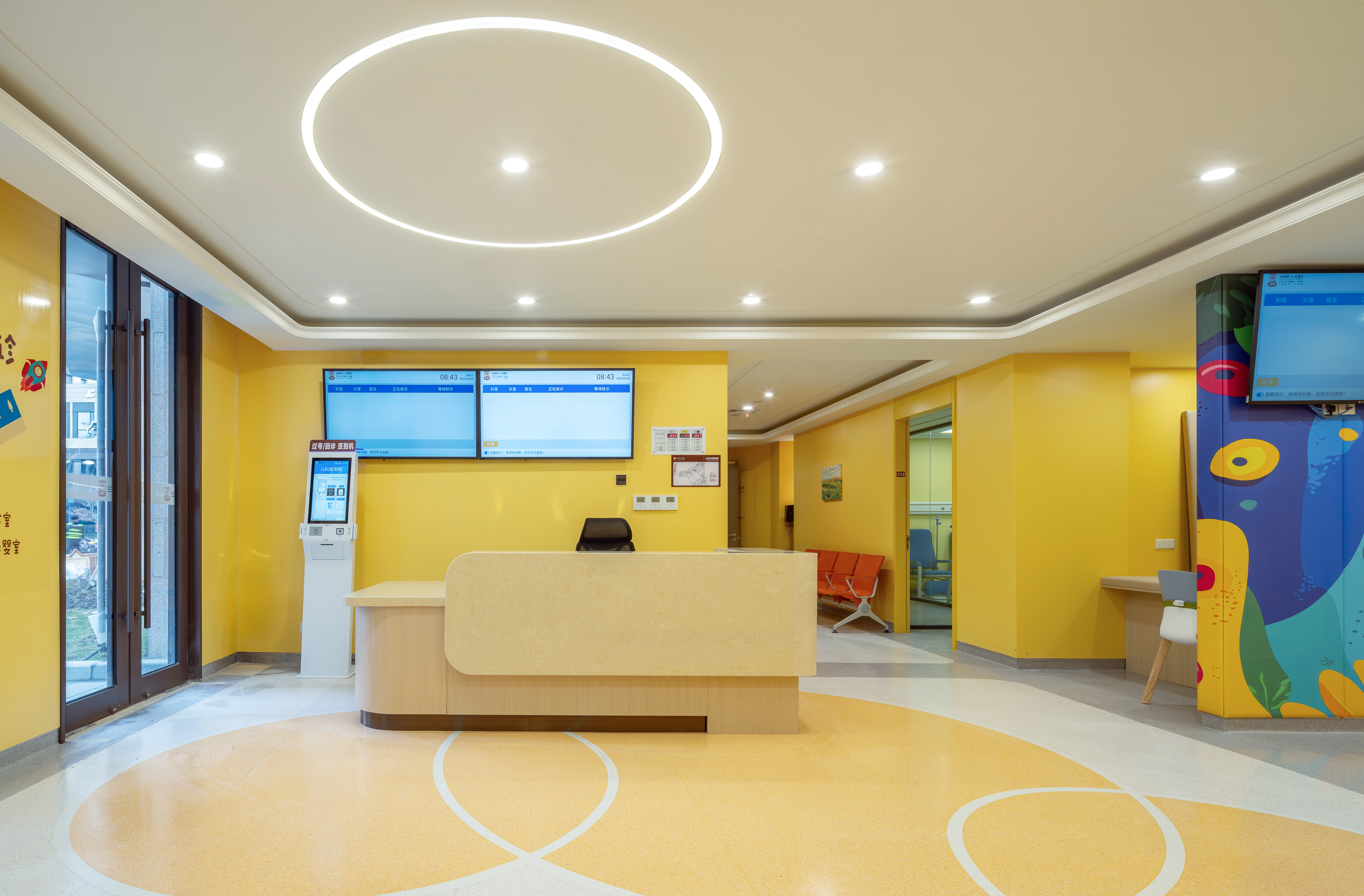 儿科诊疗空间通过地面、墙面彩绘打造沉浸式童话场景,将医疗空间转化为色彩疗愈剧场。多色系构成"视觉糖果",分散儿童的就诊注意力,降低患儿哭闹率。这种去医疗化的环境设计,用艺术语言重构了儿童对医院的认知图谱。