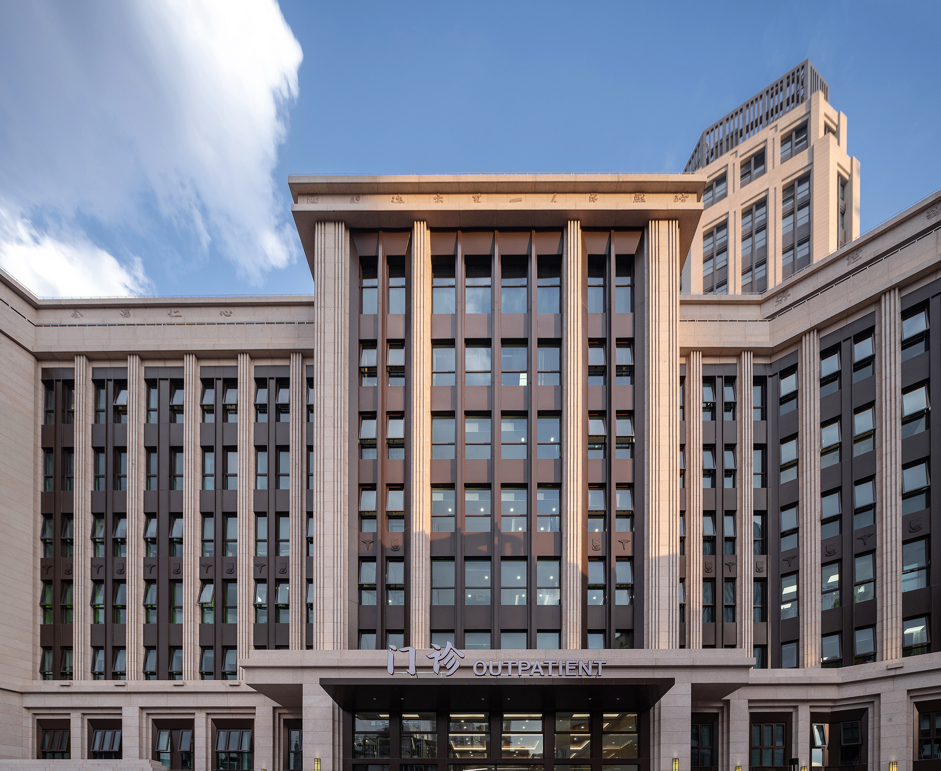 设计挖掘上海海派文化与市一院建筑文脉,依托原有框架通过虚实体量重构,将古典三段式比例转化为现代医疗建筑韵律;既延续历史记忆,又赋予立面时代感。