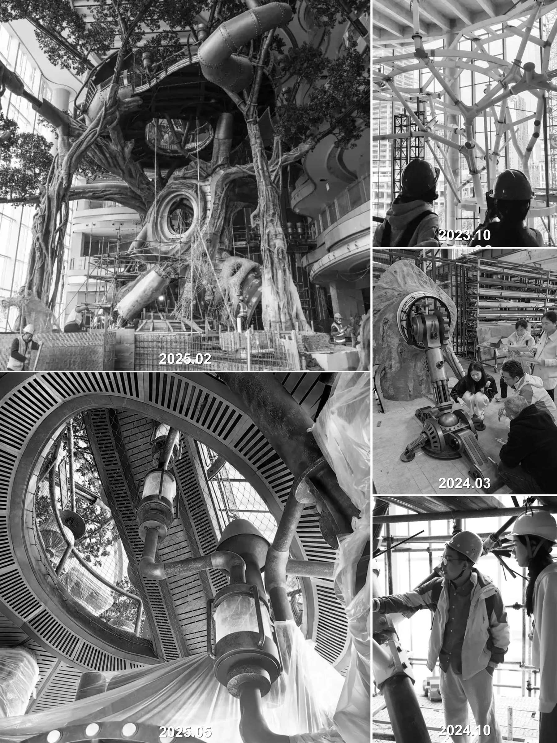 Building on this foundation, the XISUI Design team stepped in to take over and lead the comprehensive schematic design for the Wonder Tree installation. Confronted with a project demand brimming with fantastical tension and constructive ambition, the designers engaged in a rigorous three-and-a-half-year process. This included revisiting the overall form of the Wonder Tree, researching historical materials of the Steam Age, designing the natural exploration system ("Earth Purification Plan" and "Gene Storage Plan"), studying the branching growth logic and structural mechanics of the tree, creating mechanical animal figures integrated with participatory functions, coordinating with various disciplines (plumbing, electrical, lighting, and planting) on tree-mounted elements, constructing holographic models for detailed construction guidance, implementing hidden designs for detailed functional equipment and safety instruction signage, as well as drafting complete construction drawings for the Wonder Tree.