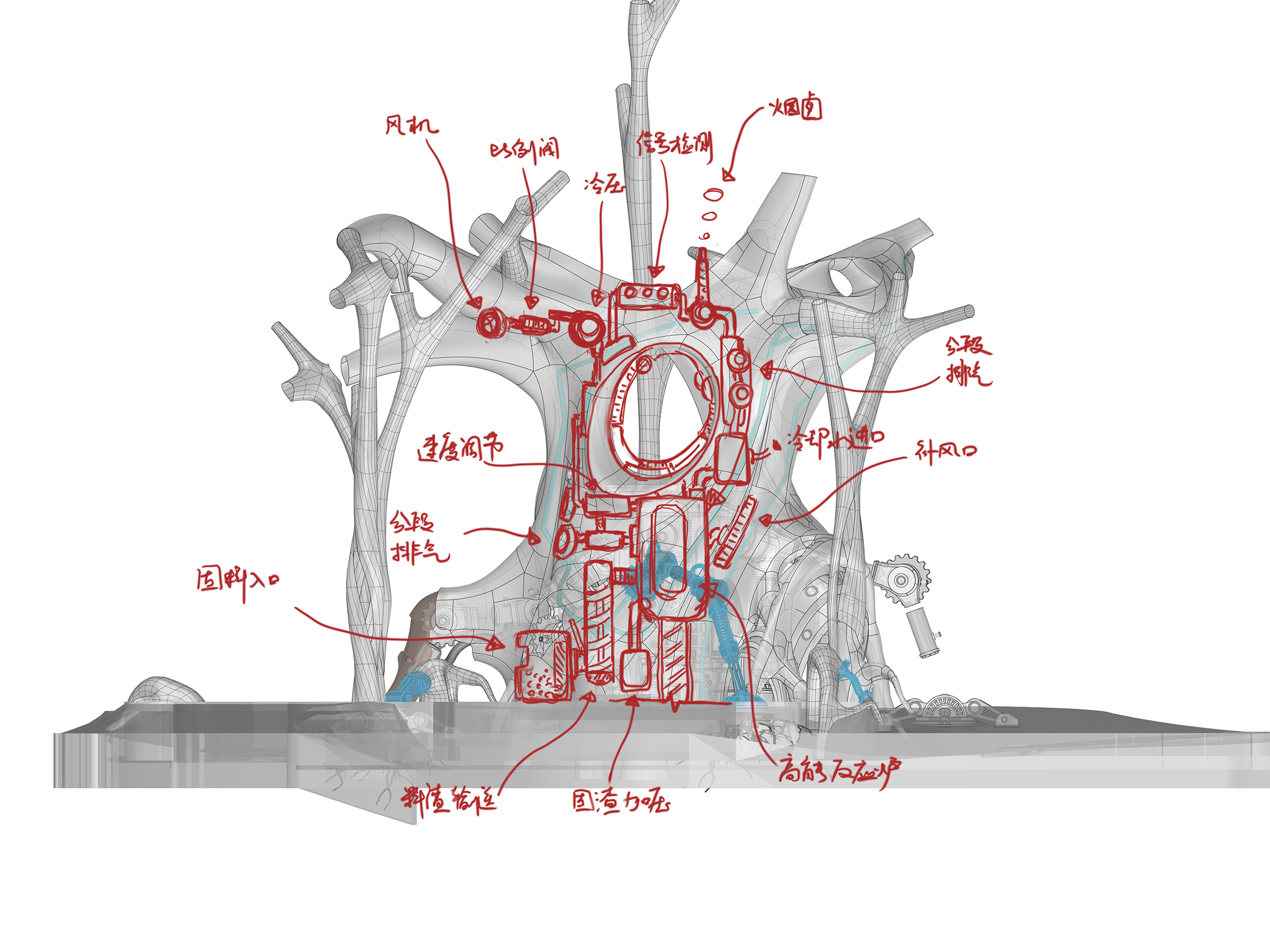 在这里,我们通过世界树的主题设定,探讨着一种理想化的方式:世界树帮助人类净化一方土地,而人类拥有技术且正义的一方,赋予世界树机械动力化的改造,让其可以拔地而起,行走于地球表面,为不同的地域带来净化的力量。人类文明与世间万物,是否可以成为一种可持续的,共生依存的模式呢?