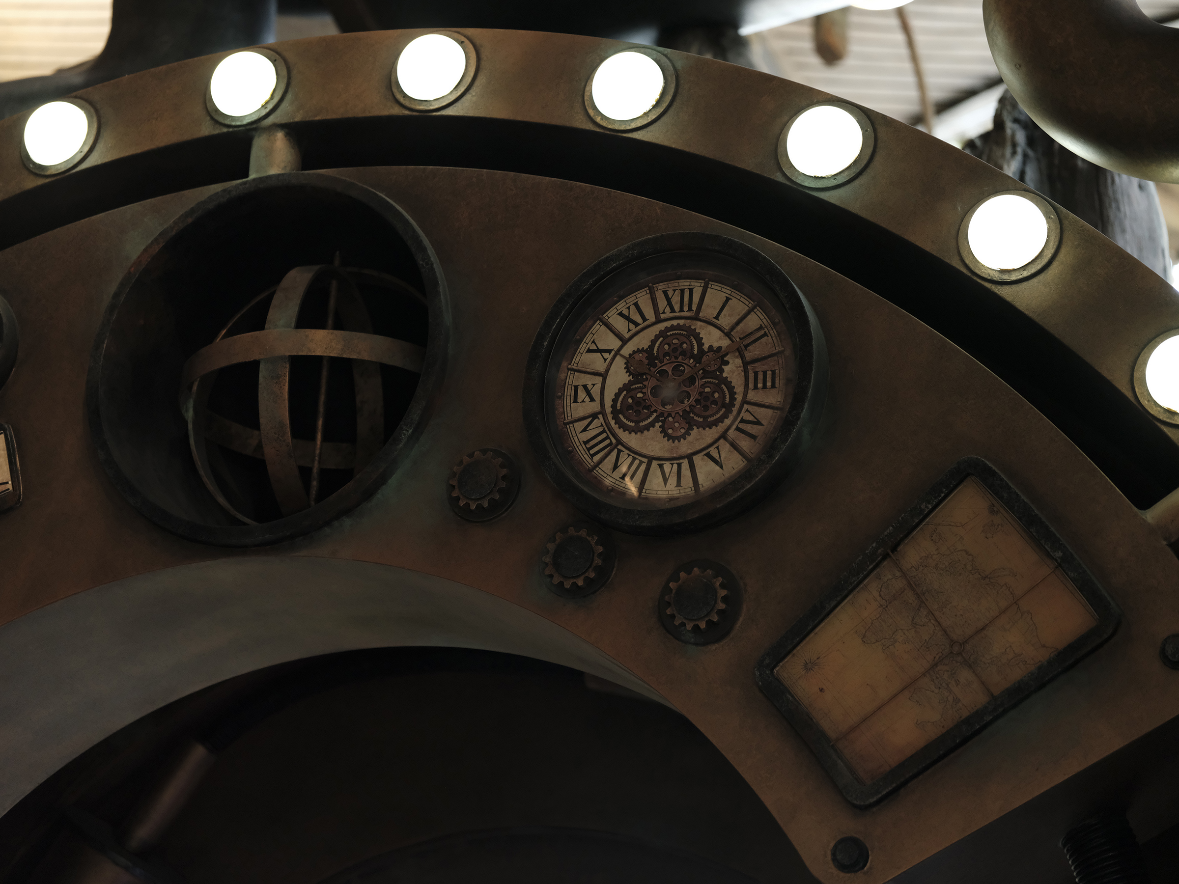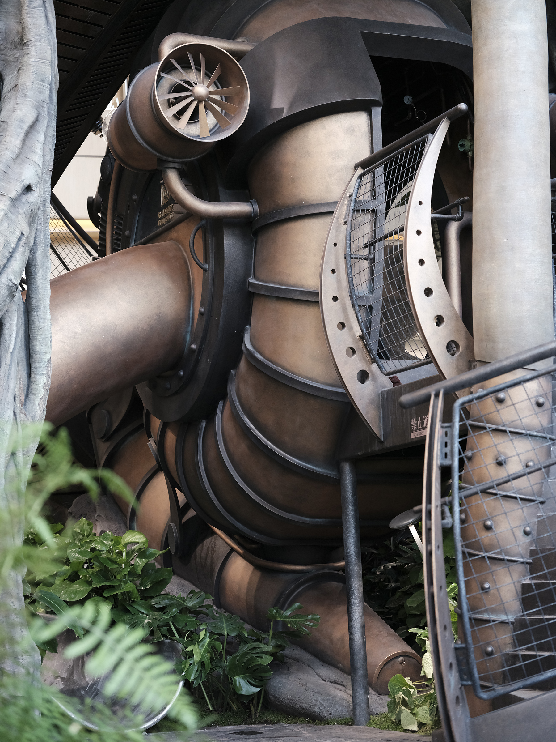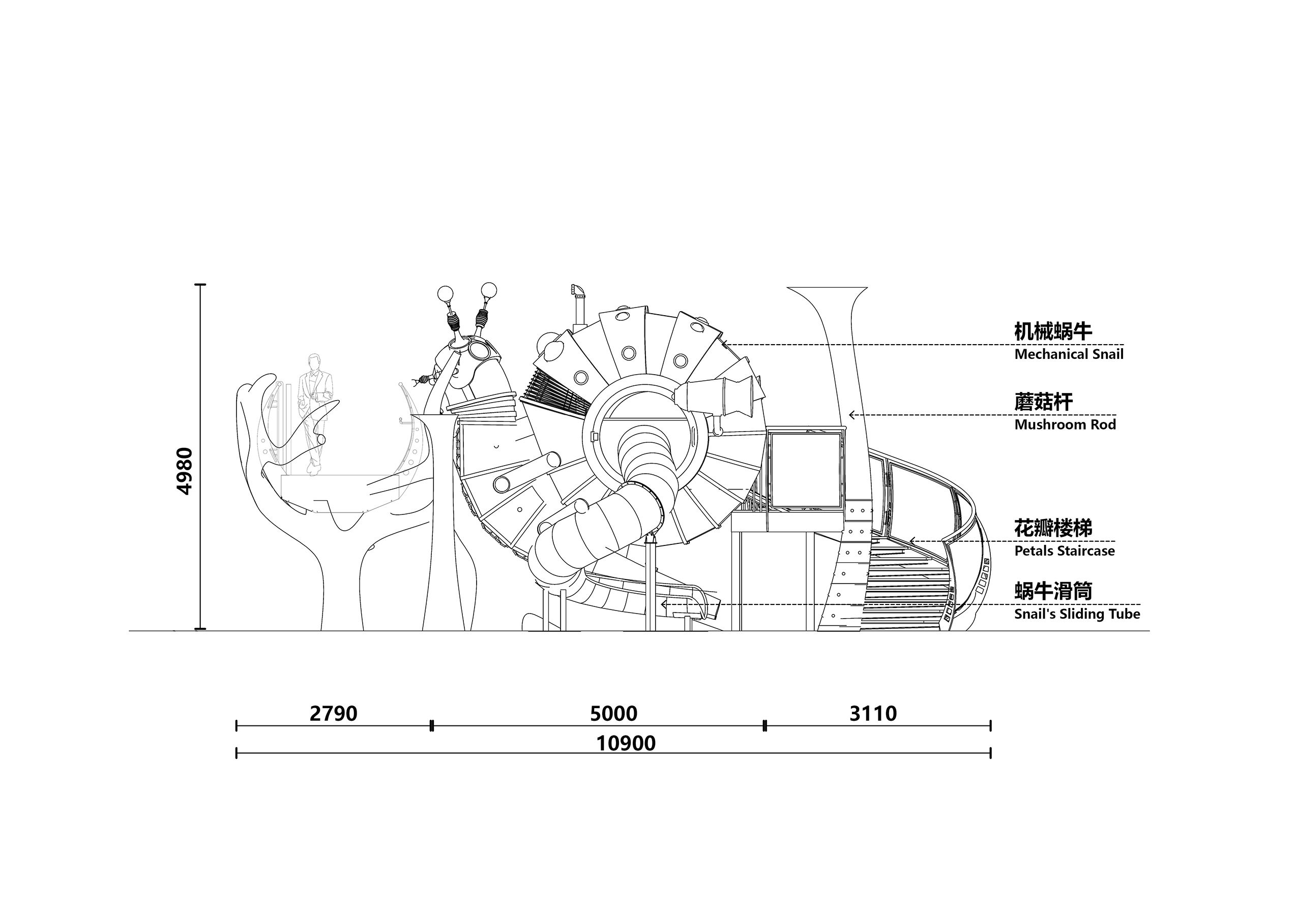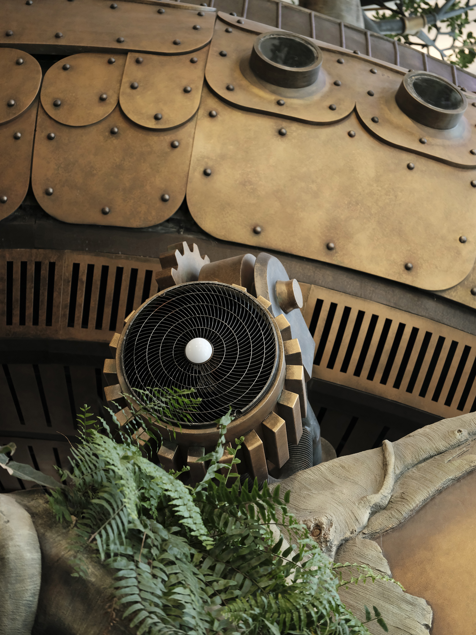 喜随设计团队在此基础上介入,接力并主导了世界树总体装置的全面方案设计工作,面对这样一个充满奇幻张力和建造魄力的项目诉求,在历时三年半的时间里,设计师们经历了从世界树整体装置造型重新推敲、蒸汽时代历史资料研究、自然探索系统(“地球净化计划”与“基因存储计划”)设计,树木分枝生长逻辑及结构力学体系研究,融入参与功能的机械动物形象设计,水电灯光植物等树上各专业配合,搭建用于精细化指导施工的全息模型,各种细部功能设备、安全说明标识等等的隐藏式设计,以及世界树全套施工图纸的绘制等过程。