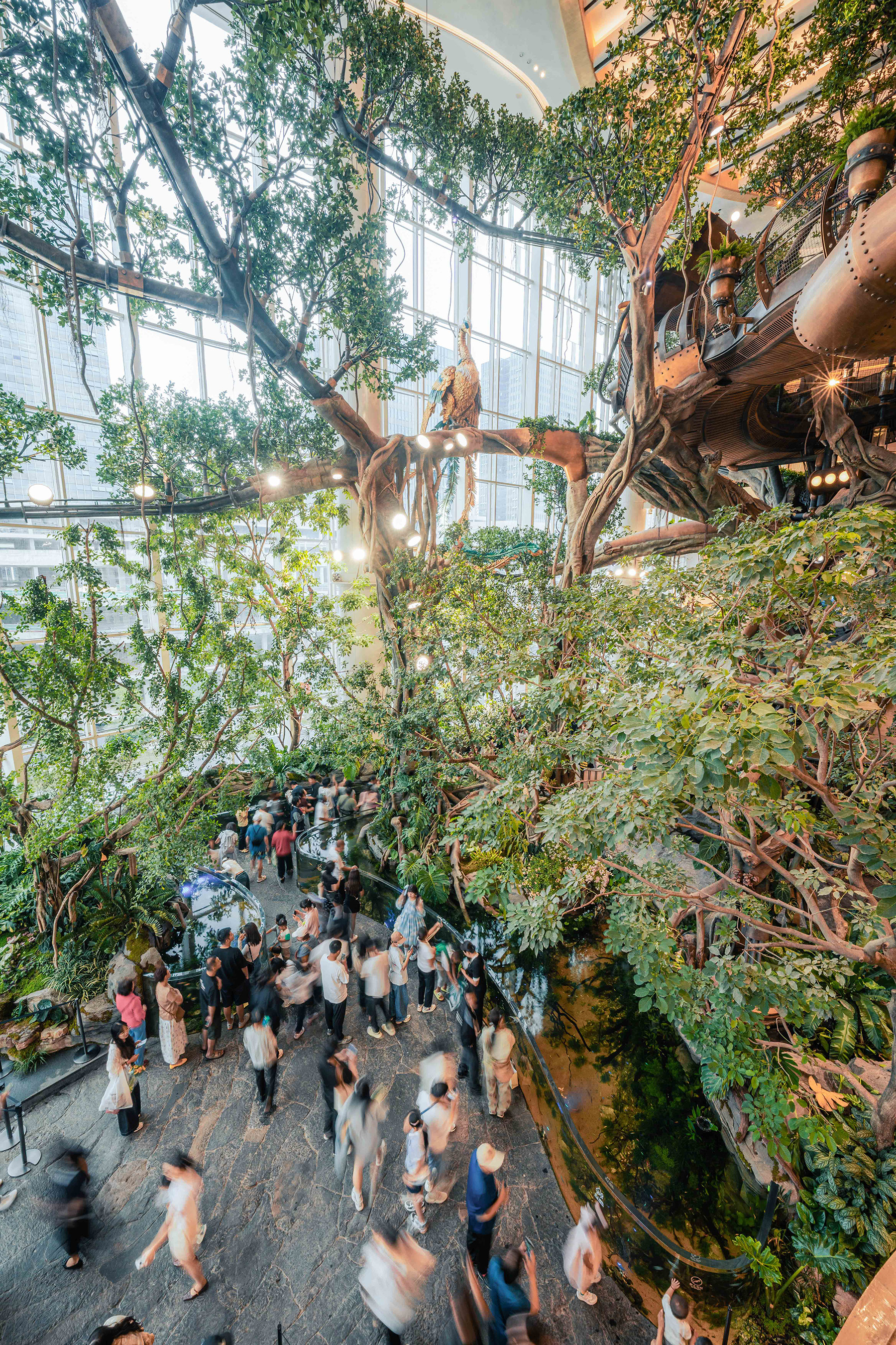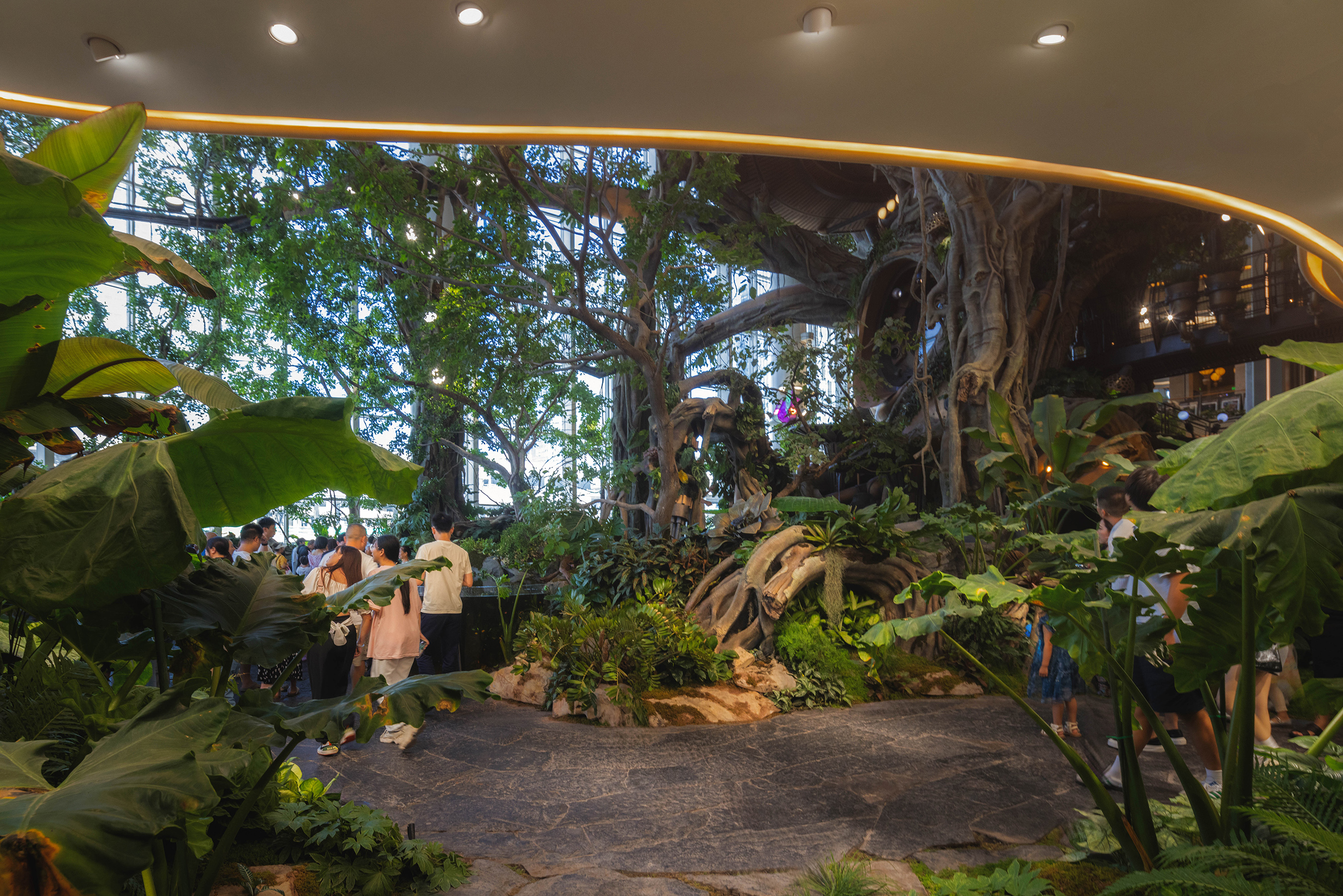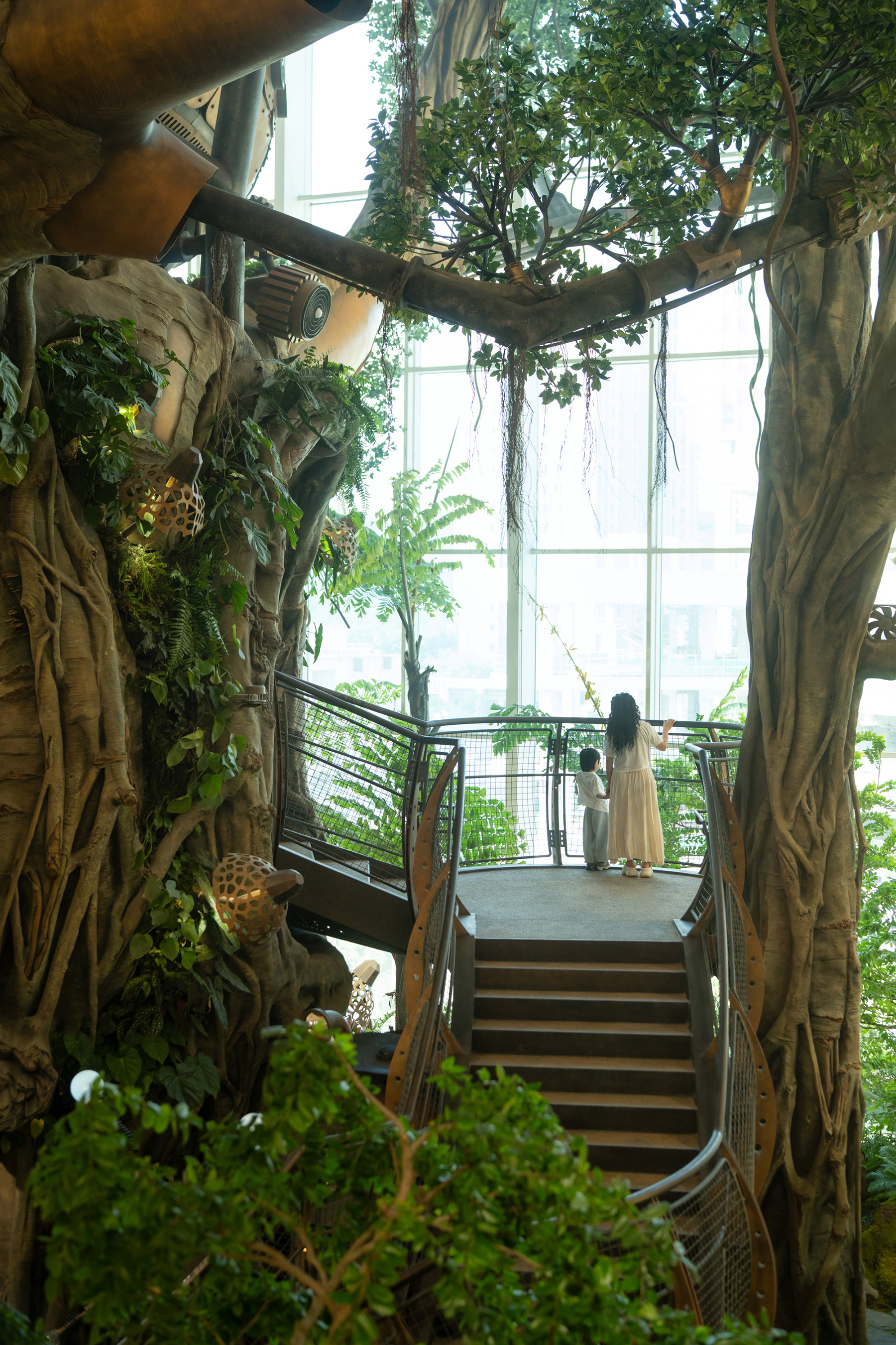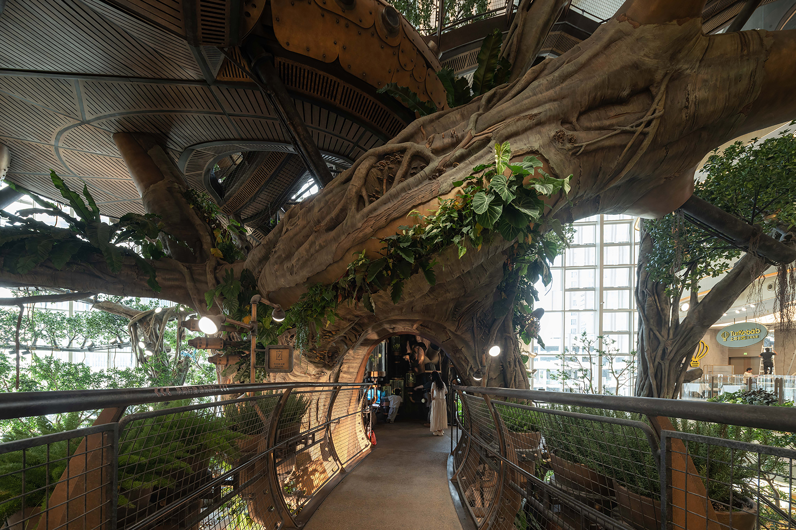 在重庆中央公园光环花园城的商业中庭,一座纵跨4层商业空间,20M高的世界树巨大装置,将蒸汽机械与奇幻森林相结合,200多种奇花异草在机械脉络中蓬勃生长,构建出一个超4000平方米的可游可触的立体生态空间。人们可以上下穿梭在这样一处童话般的奇异世界里,感受人类科技发展与自然共生交融的震撼生命力。