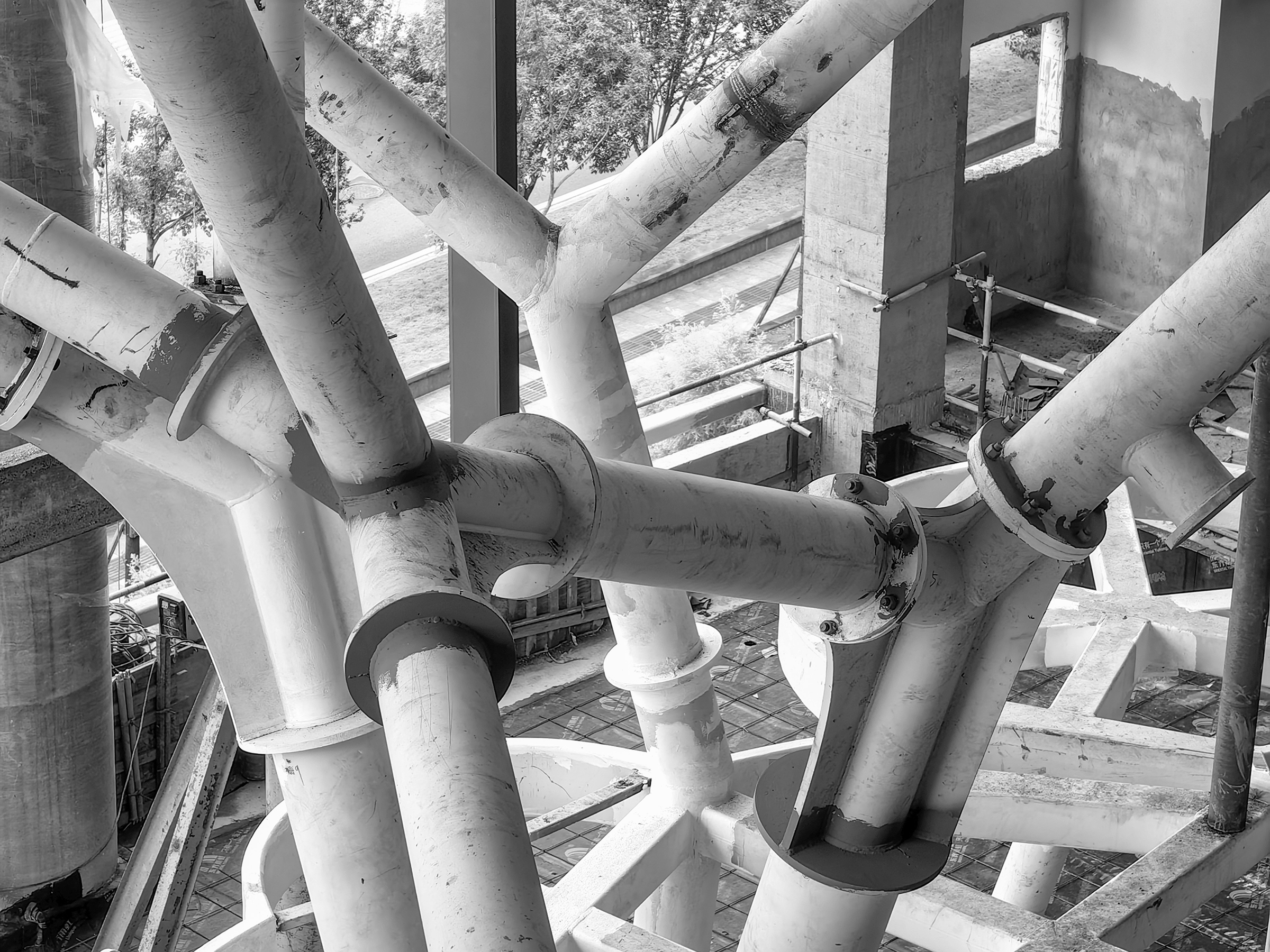 To facilitate prefabrication and echo the craftsmanship characteristics of the Steam Age, the main structure is designed with various assembly and connection nodes: massive flange plate nodes for convenient prefabrication in the factory and subsequent batch transport to the site for assembly; bifurcation joints that effectively transfer forces at branch bends and branching points; and "Gatling" nodes that realize local diameter transitions between thick and thin parts, featuring mechanical armor aesthetics and specialized functionality. The further development and construction of the steel structure in the subsequent implementation phase were completed by Shanghai Roboticplus TECH team. As one of the few domestic teams specialising in architectural intelligent construction, Roboticplus TECH showcased secure and stable structural guarantees through the optimization of detailed nodes, precise digital processing, and structural pre-cambering.