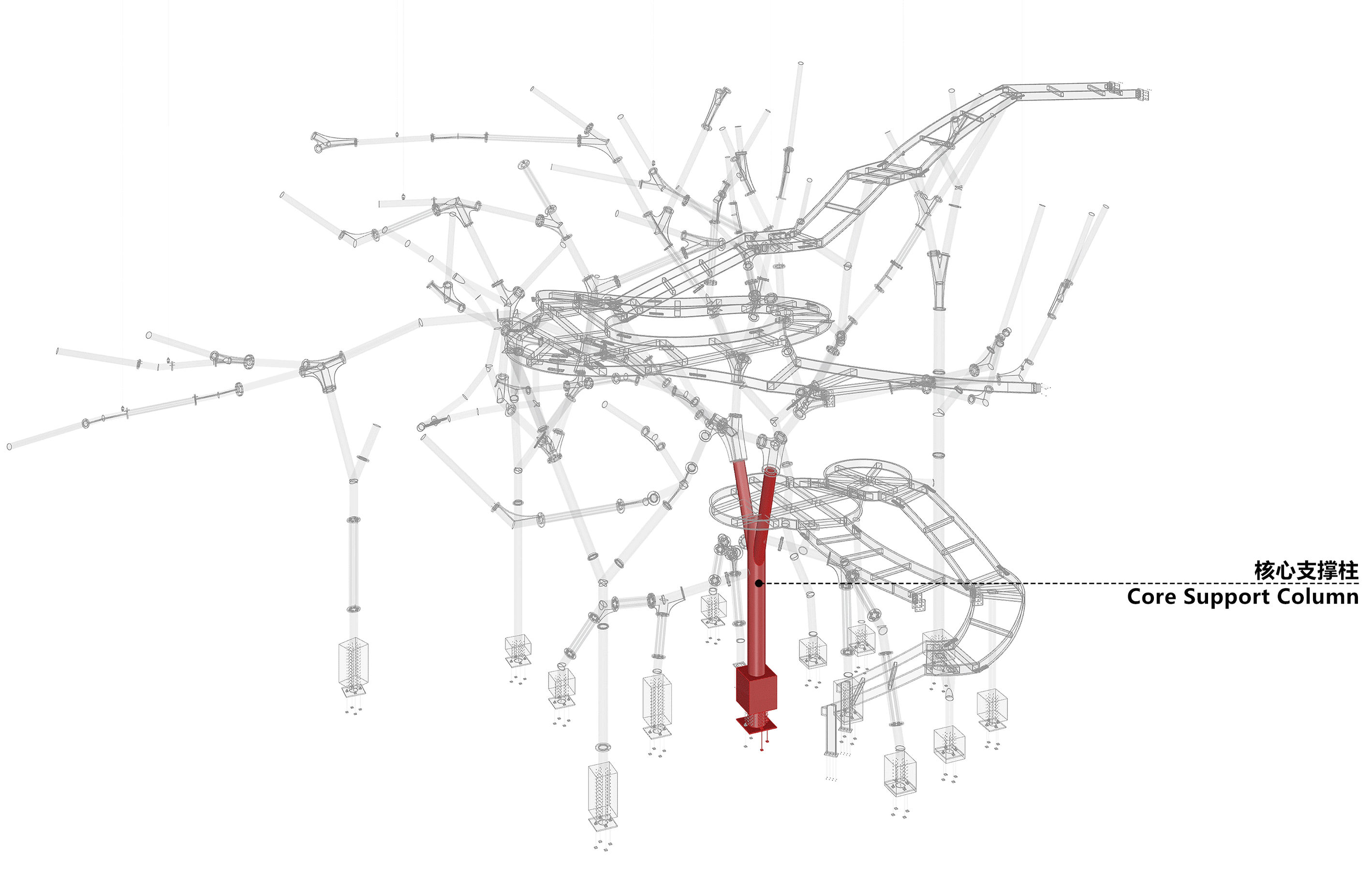 ①核心支撑柱:立于树干正中,隐藏于世界树能源核心筒和种子博物馆内部。