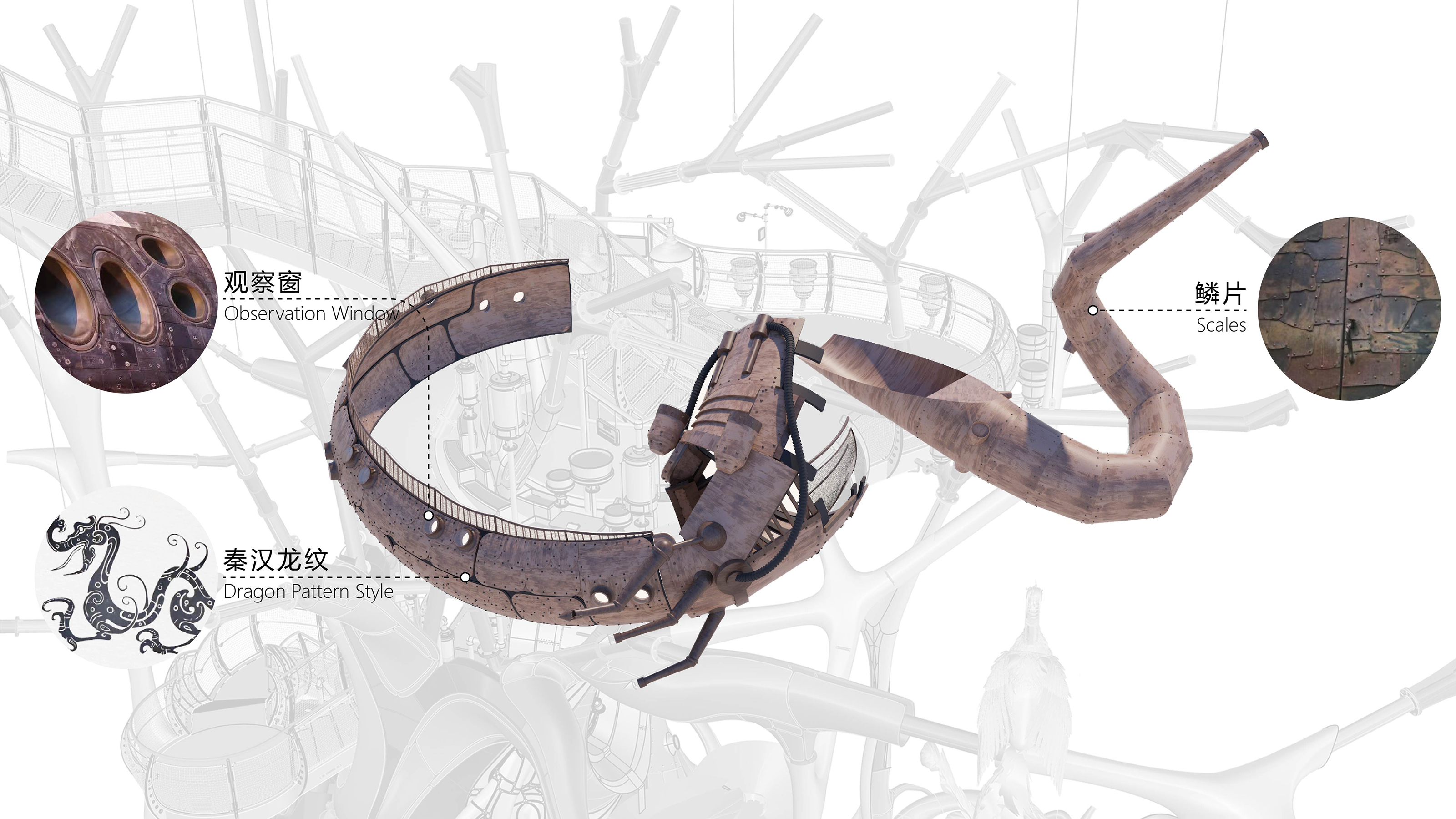 ③ Aerial Root System: Modelled on the aerial roots of natural banyan trees, it supports the lateral extension of canopy branches and ensures the stable installation of mechanical creatures (such as the "Divine Bird") on the branches.