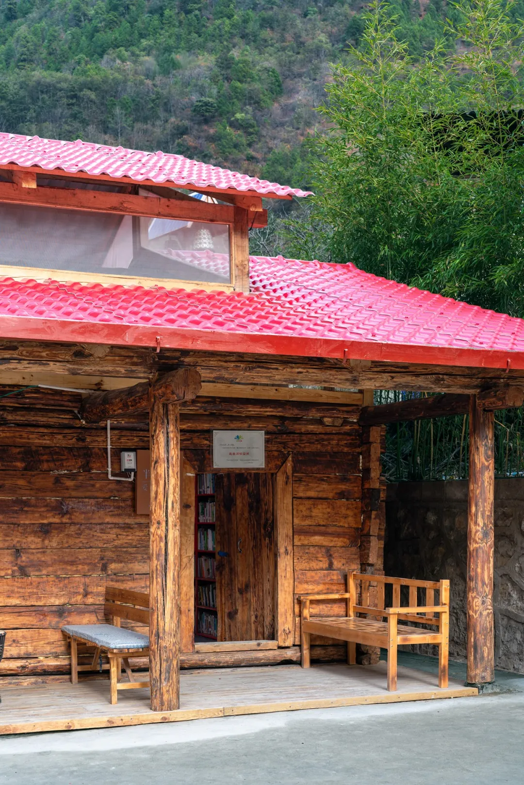 所有新增木质结构均采用本地最常见的4x8木方,由本地木工在现场几天内迅速搭建完成。屋面材料用长条的红色树脂瓦替代原本的片状石棉瓦,解决屋面漏水问题。红色树脂瓦和红色排水檐沟将新改造的屋顶部分与老房子的传统结构从视觉上脱开。室内家具也均为红色,与木结构共同形成温暖和谐的空间氛围。
