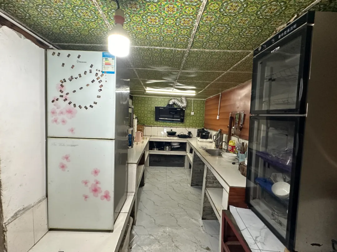通过实地考察,我们可以推断出后期屋主改造的部分:在平面上,屋主将原单一空间隔为厨房和教室两个房间,并在室外加建了一个小房间,缩小了檐下灰空间。在垂直结构上,屋主拆除了屋面下的房顶,取消了原本用来晾晒庄稼的夹层,保留原房顶的木梁并做了室内吊顶。由于原夹层空间是敞开式,屋主在山墙面用木板将洞口封闭,形成新的围护墙面。我们猜测屋主取消屋顶夹层是因为没有晾晒庄稼的功能需求,且希望室内空间得以变高,不过这并没有改善采光和通风。另外,由于本地已停止生产石片屋面,屋主用平价的灰色石棉瓦代替了传统石片,但瓦片之间有多处缝隙,经常漏水。