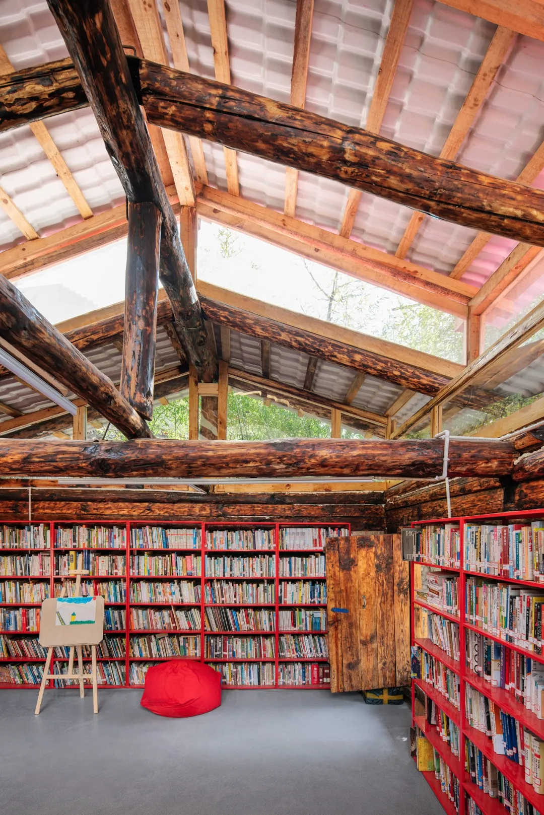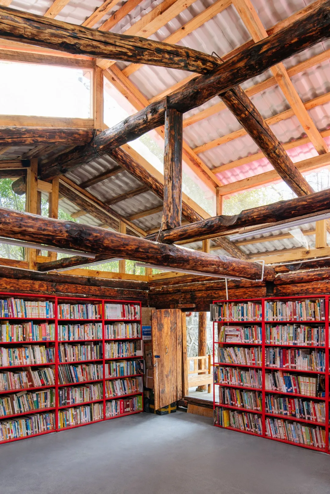 接下来最重要的是解决采光和通风问题:我们沿着井干墙体上部新做了一圈侧向高窗,并将屋顶整体翻新:在原木斜梁的基础上重做檩条和屋面,新增顶部天窗,侧向高窗和顶部天窗极大地提升了室内采光。侧向高窗用透明耐力板封上,而顶部天窗侧面仅用白色纱窗封上,可作为拔风井提升室内通风,同时防蚊虫和落叶。