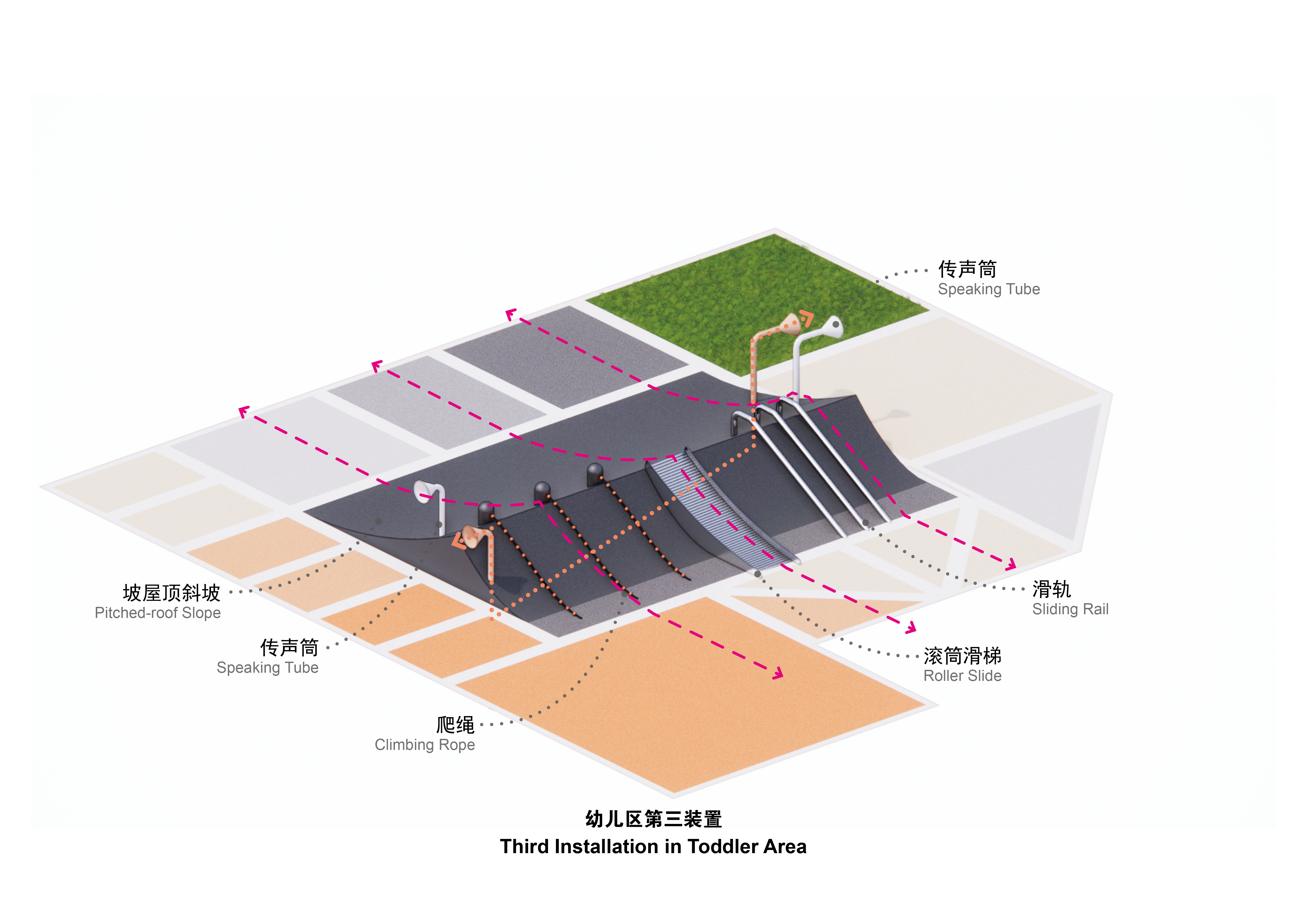 全龄活动区主装置两层平台分别链接圆筒滑梯、平衡木通道与孔明灯平台,并且于下方瓦面斜坡、钻洞、爬网和不锈钢滑梯等元素相互呼应,在场景中,我们希望打破年龄界限,形成共享欢乐空间,无论是大人还是孩子,都能在这里找到属于自己的乐趣。