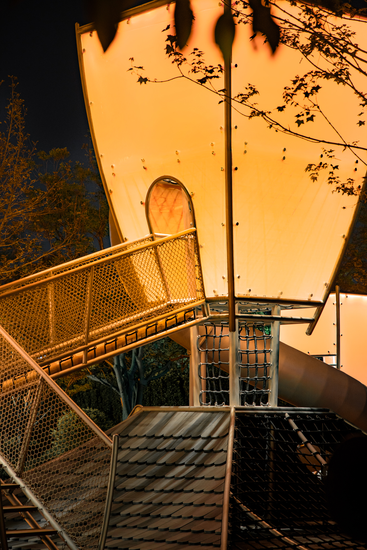 作为全场的视觉焦点,孔明灯主装置橙红渐变色从 “灯顶” 延伸至地面,模拟灯笼散发的暖光照亮黑夜。攀上爬网平台制高点脚下便是深灰色瓦片地面构成的 “万家屋顶”,此刻在地文化与玩乐体验得到有趣融合。