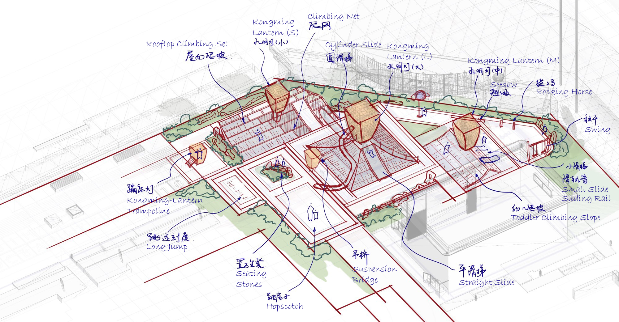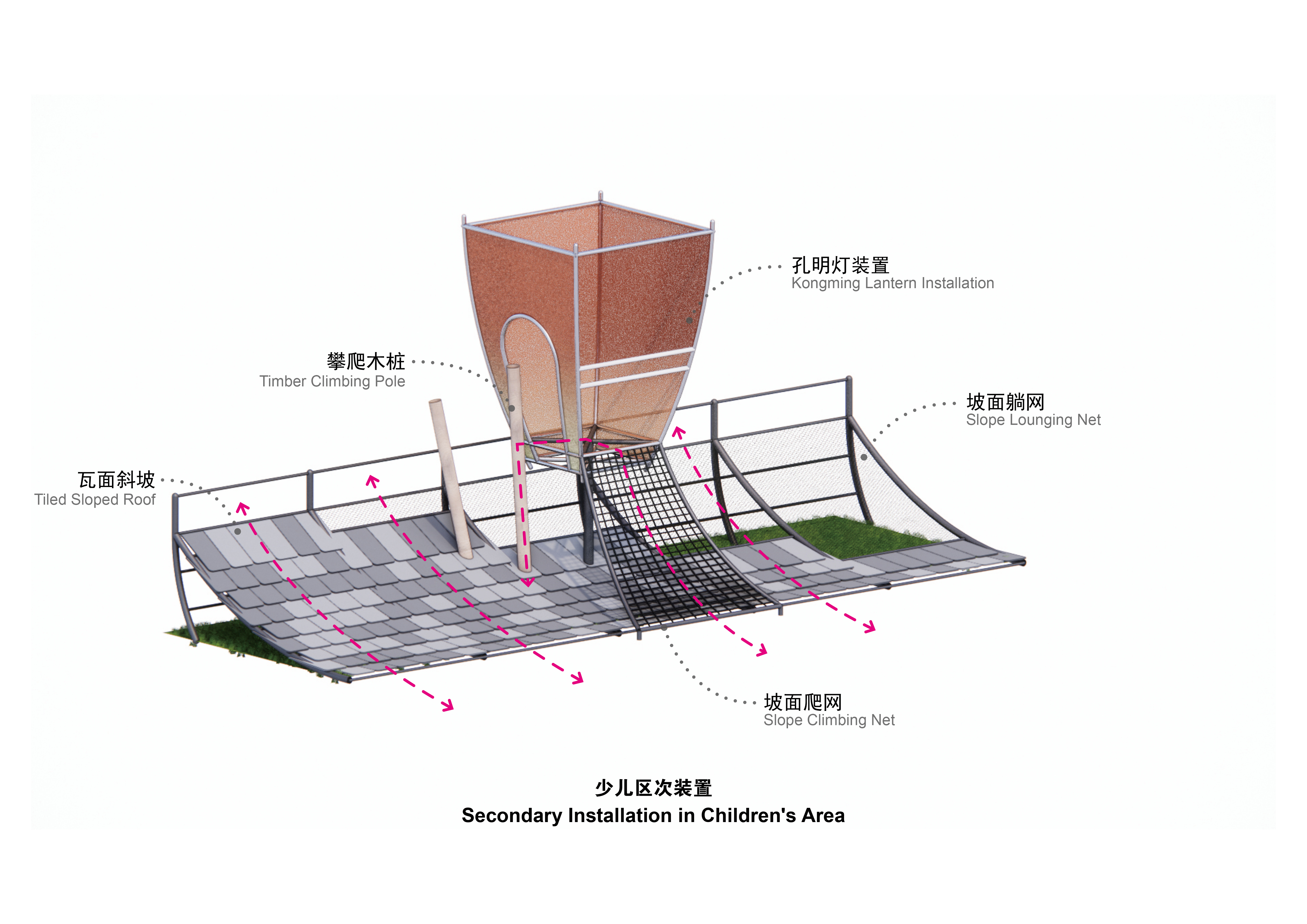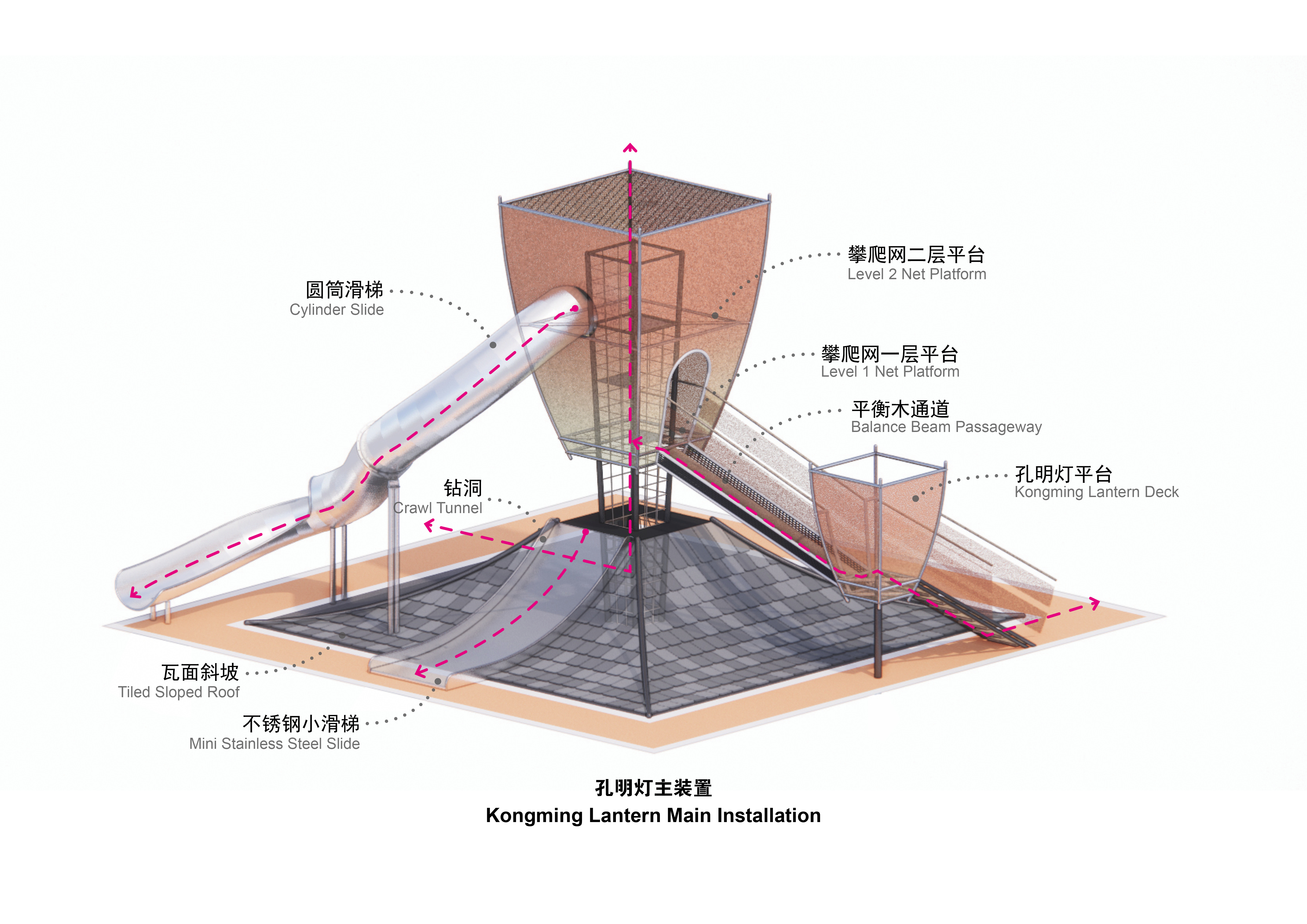设计以孔明灯与屋顶为原型打造一座“漂”在屋顶上的儿童活动空间。让孩子们用另一个广阔视角看世界,他们可以在孔明灯攀爬架上步步登高,在光影隧道里开启神秘探索,在爬杆上感受悬空的刺激,在瓦面斜坡上体验飞檐走壁尽情释放活力与好奇心。