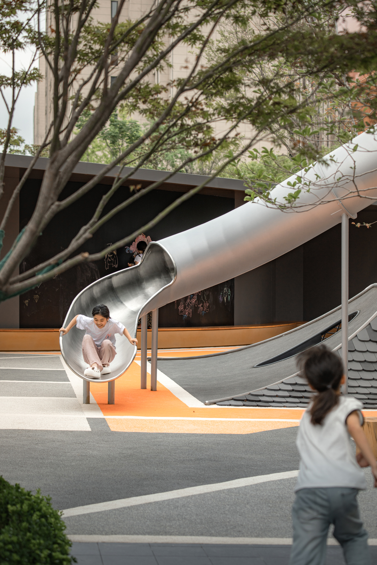 The main installation in the all-ages activity area features a two-level platform connecting to a cylindrical slide, balance beam pathway, and Kongming lantern deck. Below, elements like tiled sloped roofs, crawl tunnels, climbing nets, and stainless-steel slides create harmonizes interplay. In this space, we aim to transcend age barriers to create a shared playground of joy—where both adults and children can discover their own ways to engage and delight.