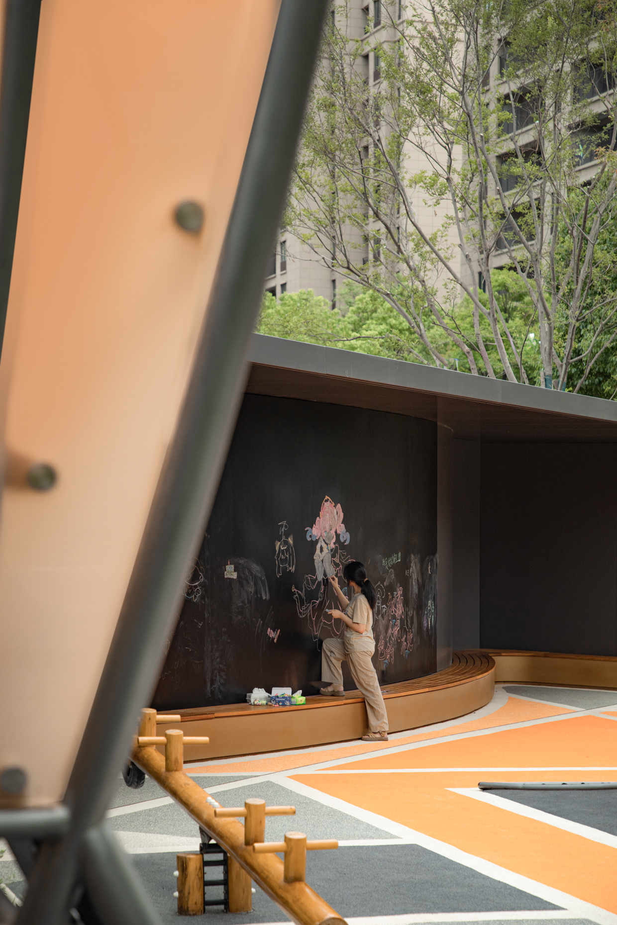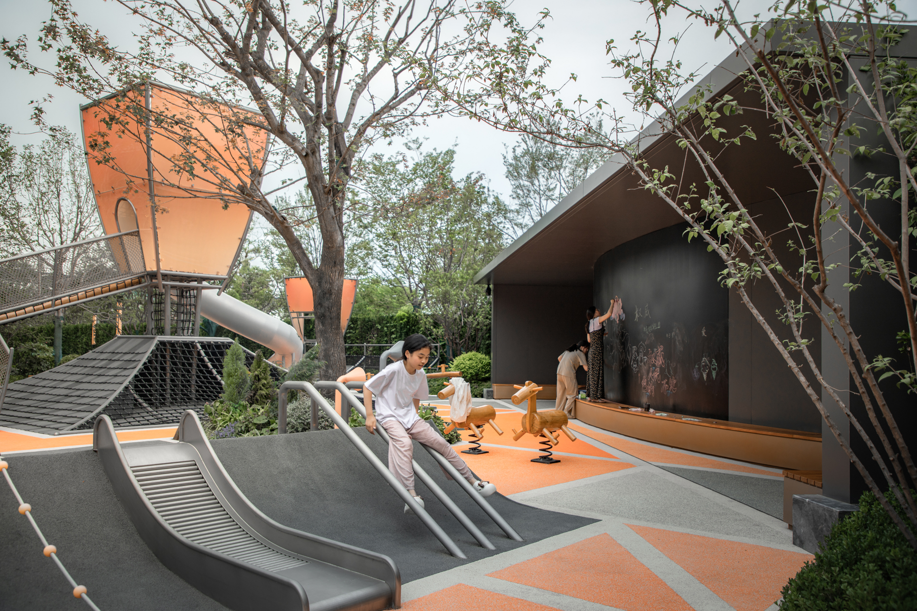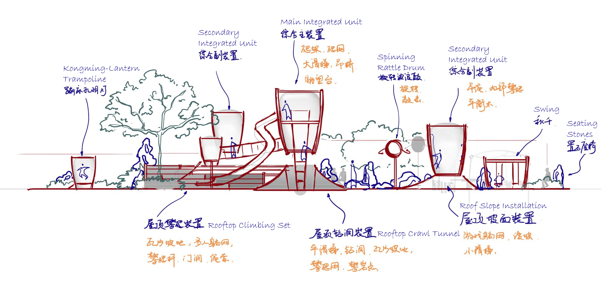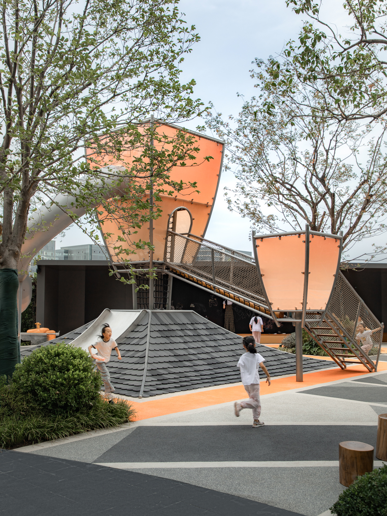 设计遵循景观环境,延续大区新中式庭院的直线元素,突破传统儿童活动空间“玩具堆砌”式的功能配套,将孔明灯主题与中式瓦片坡屋顶元素融合进不同的功能板块,最终形成一个集亲子陪伴、文化感知、全龄段儿童玩乐于一体,并承载着社交成长与本土记忆的专属活动空间。
