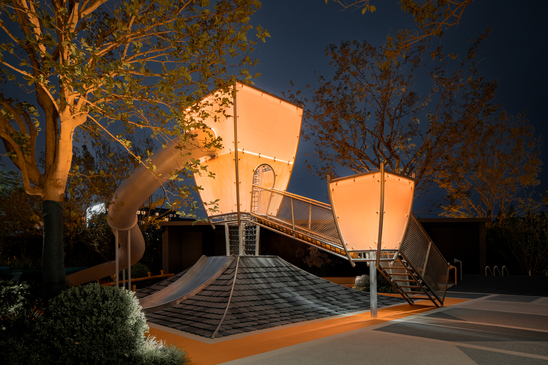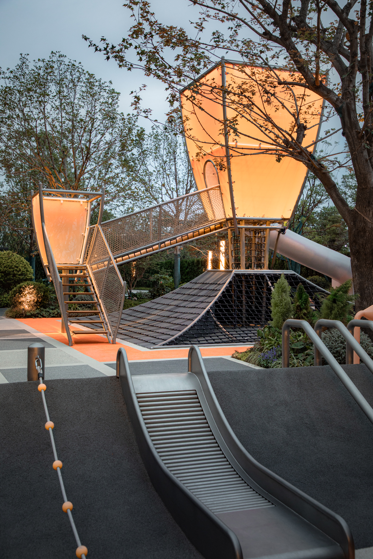 All facility edges are rounded to prevent injuries from bumps and collisions. The overall spatial design continues the linear architectural language of the Neo-Chinese courtyard from the master plan, with the Kongming antern installation echoing the tiled rooftops. At night, the lighting of the installations creates a dreamy atmosphere, merging traditional aesthetics with contemporary scenes.