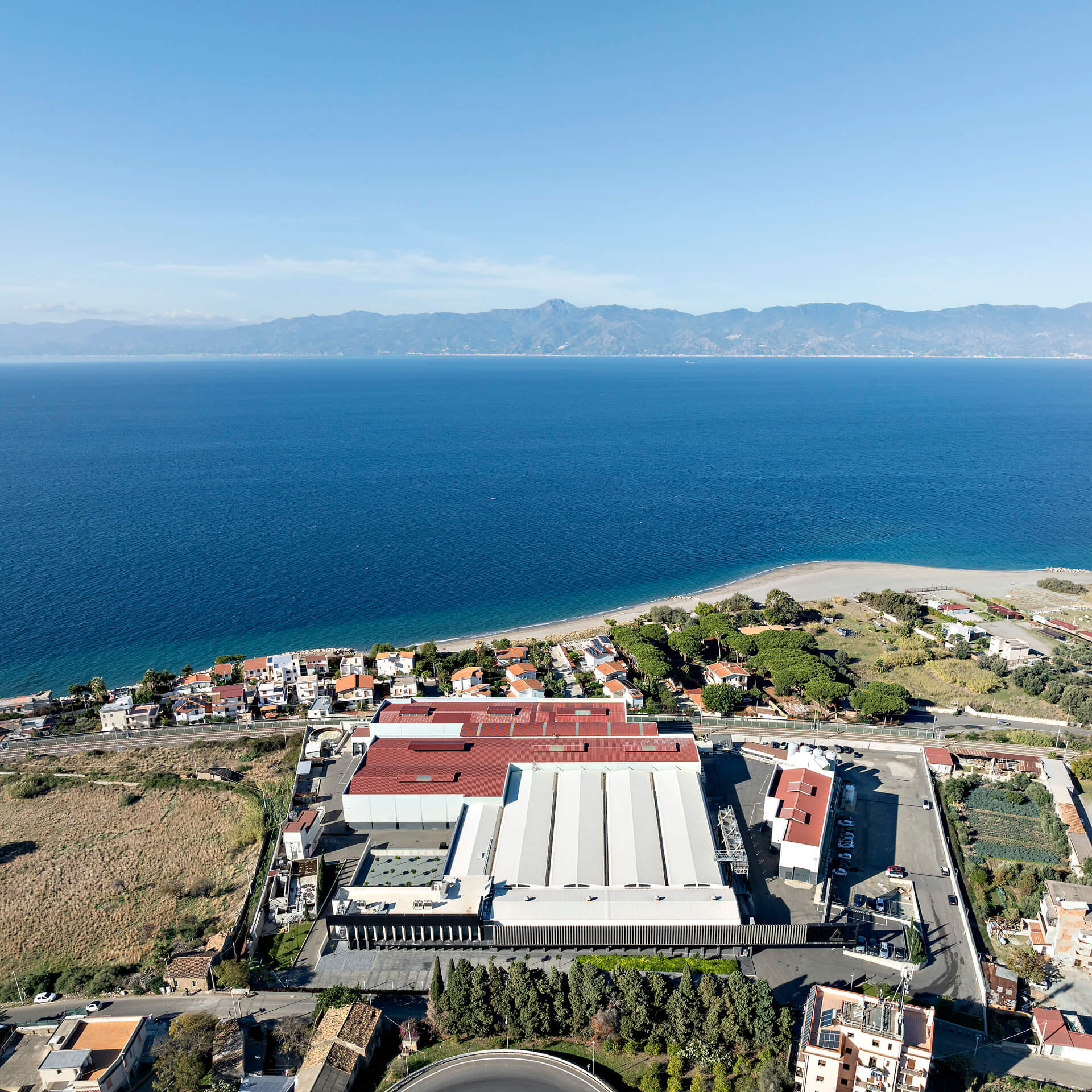 Calabrian coast, near the Strait of Messina: a Coca-Cola plant is chosen by Capua 1880, a leader in the production of citrus essential oils for the most renowned beauty and fashion brands, to expand its production space. The result is a project that transforms a disused area by creating a modern and sustainable production pole, in which nature becomes an integral part of the building and the panoramic view of Mount Etna, with its majestic profile, becomes a distinctive element and a direct connection with the landscape.
