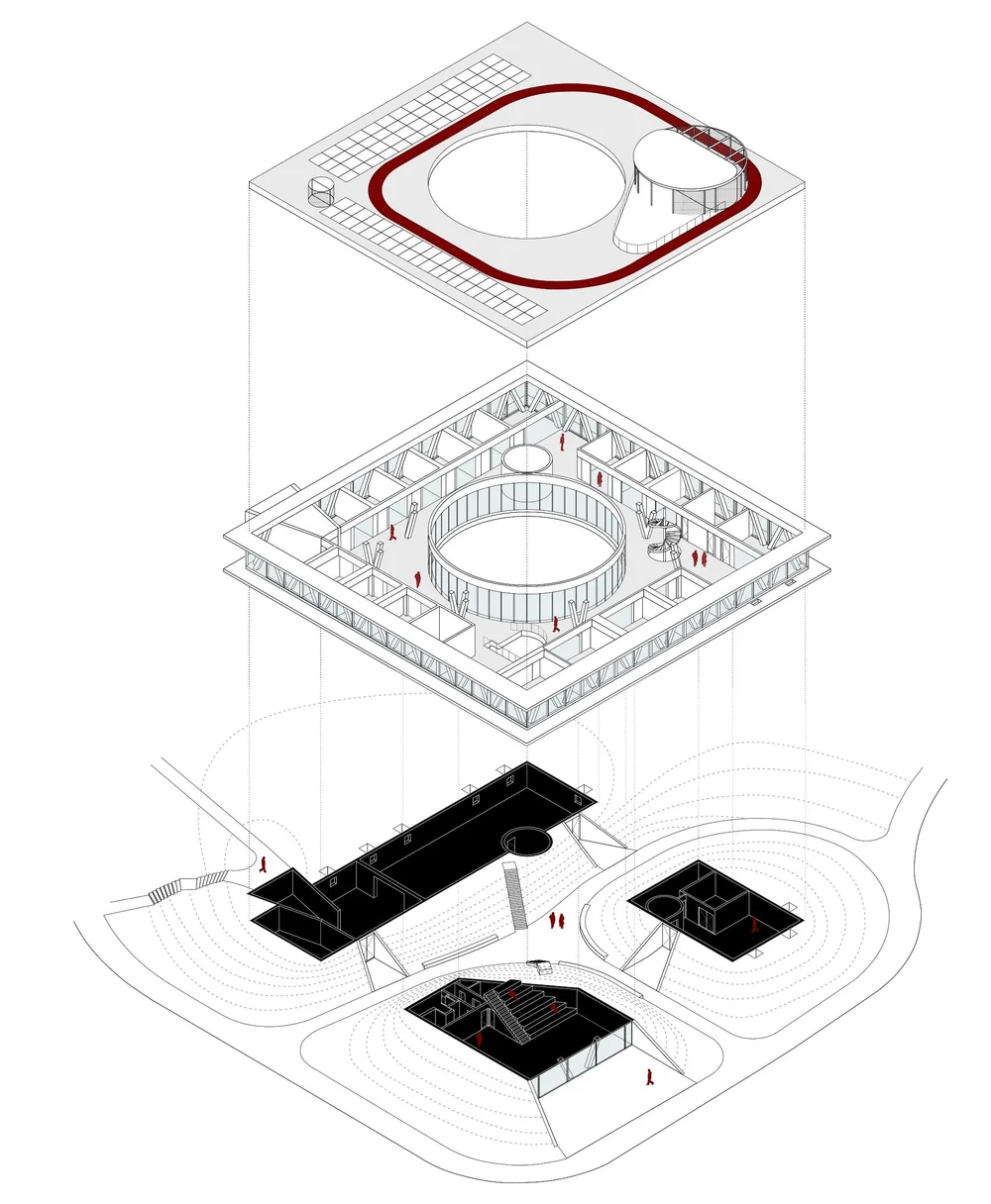 Encircling the atrium, this primary circulation hub houses the entrance, reception desk, hot-desk workstations, a circular presentation room, and a small auditorium. These spaces extend toward a versatile communal area and an outdoor terrace on the lower level. A spiral staircase links this hub to a small rooftop pavilion, a terrace, and a running track.