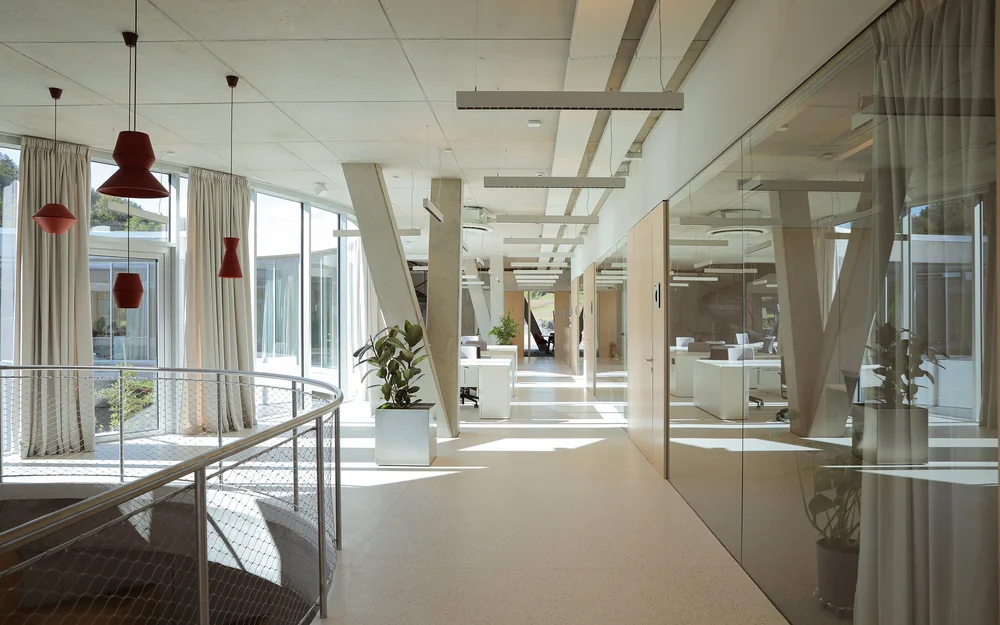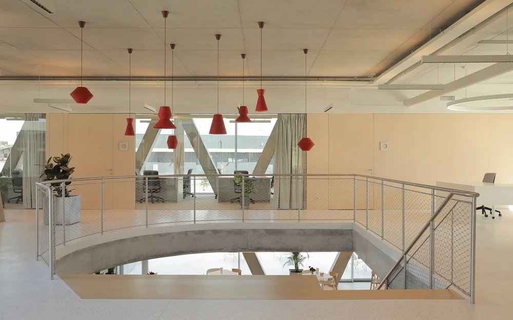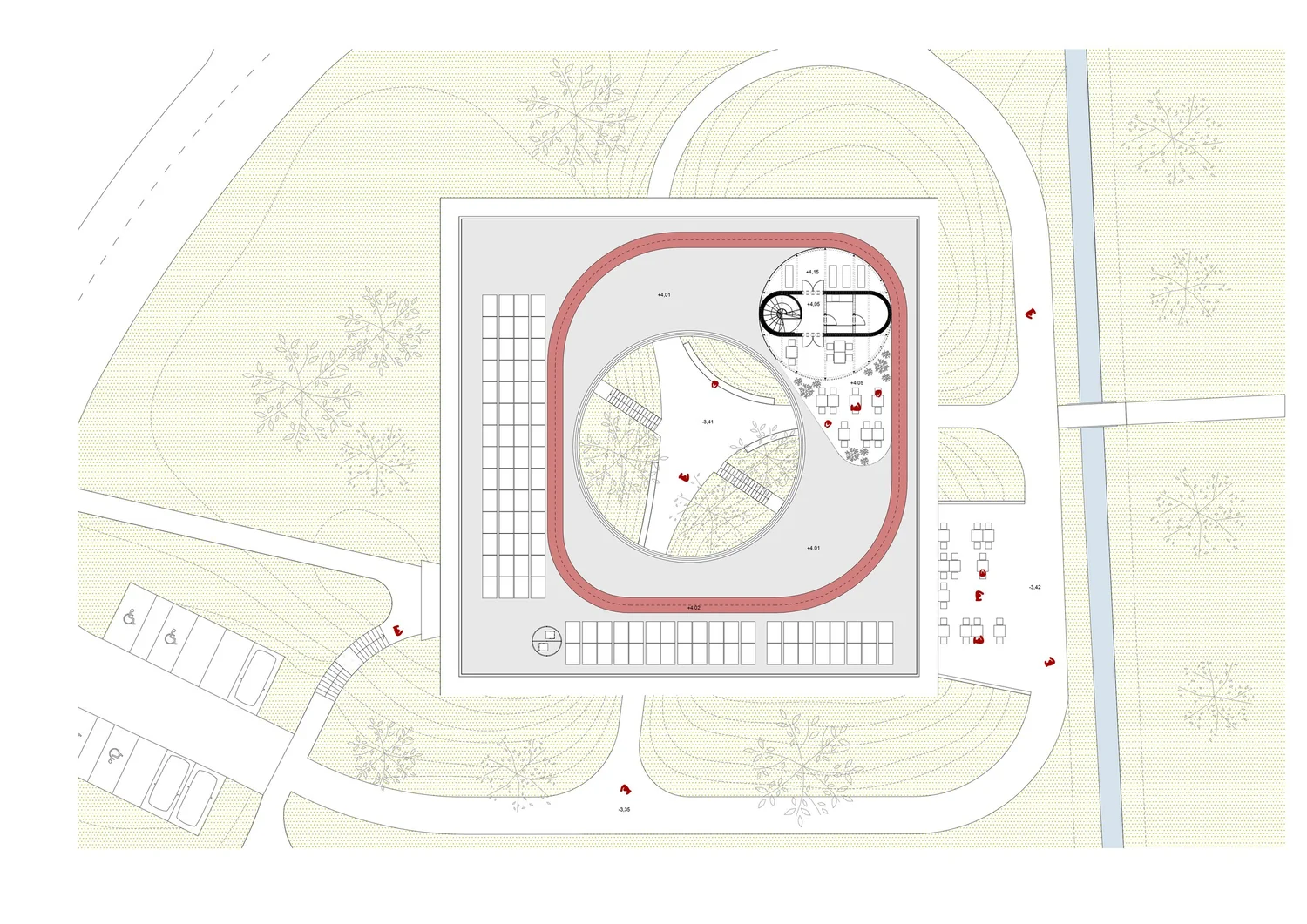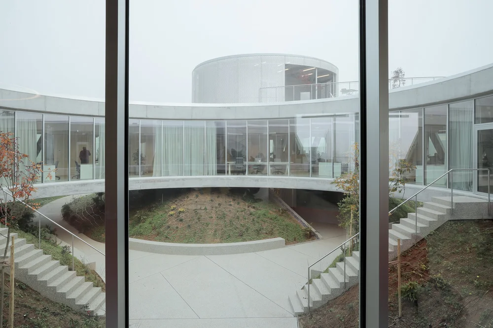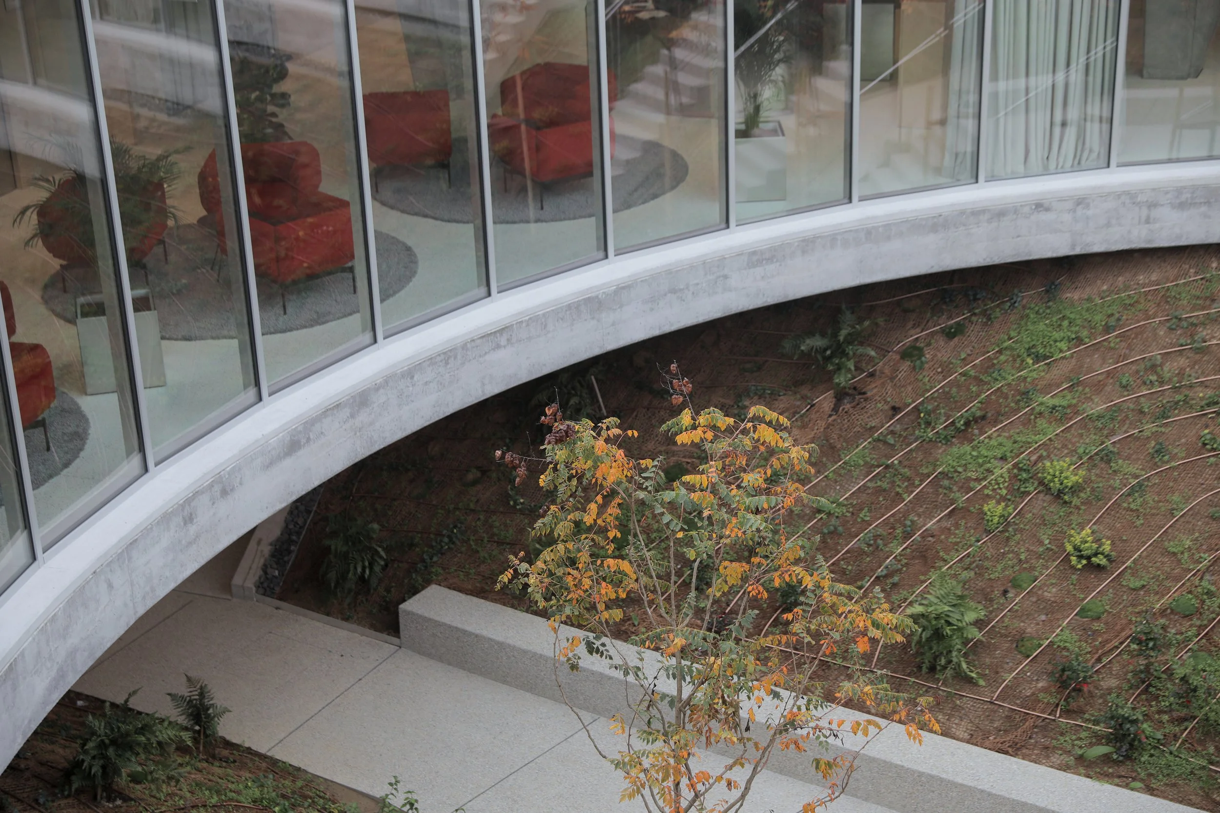 The building creates its own contextual identity while simultaneously engaging in dialogue with the surrounding natural landscape and the newly constructed adjacent development. With a continuous landscape extending beneath the building, the atrium becomes the focal point of both indoor and outdoor spaces, blurring the boundaries between them.