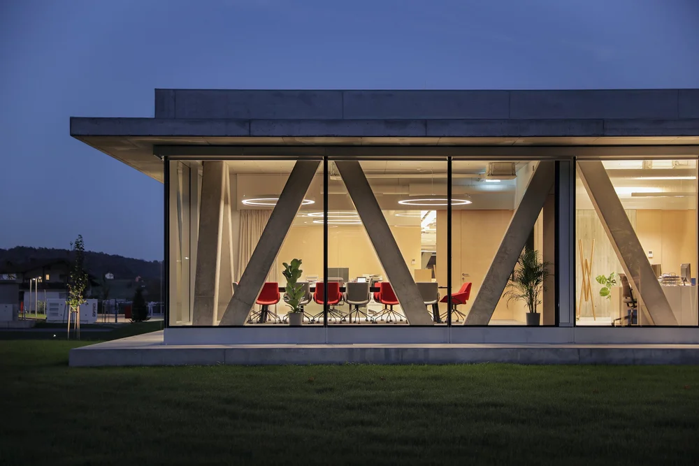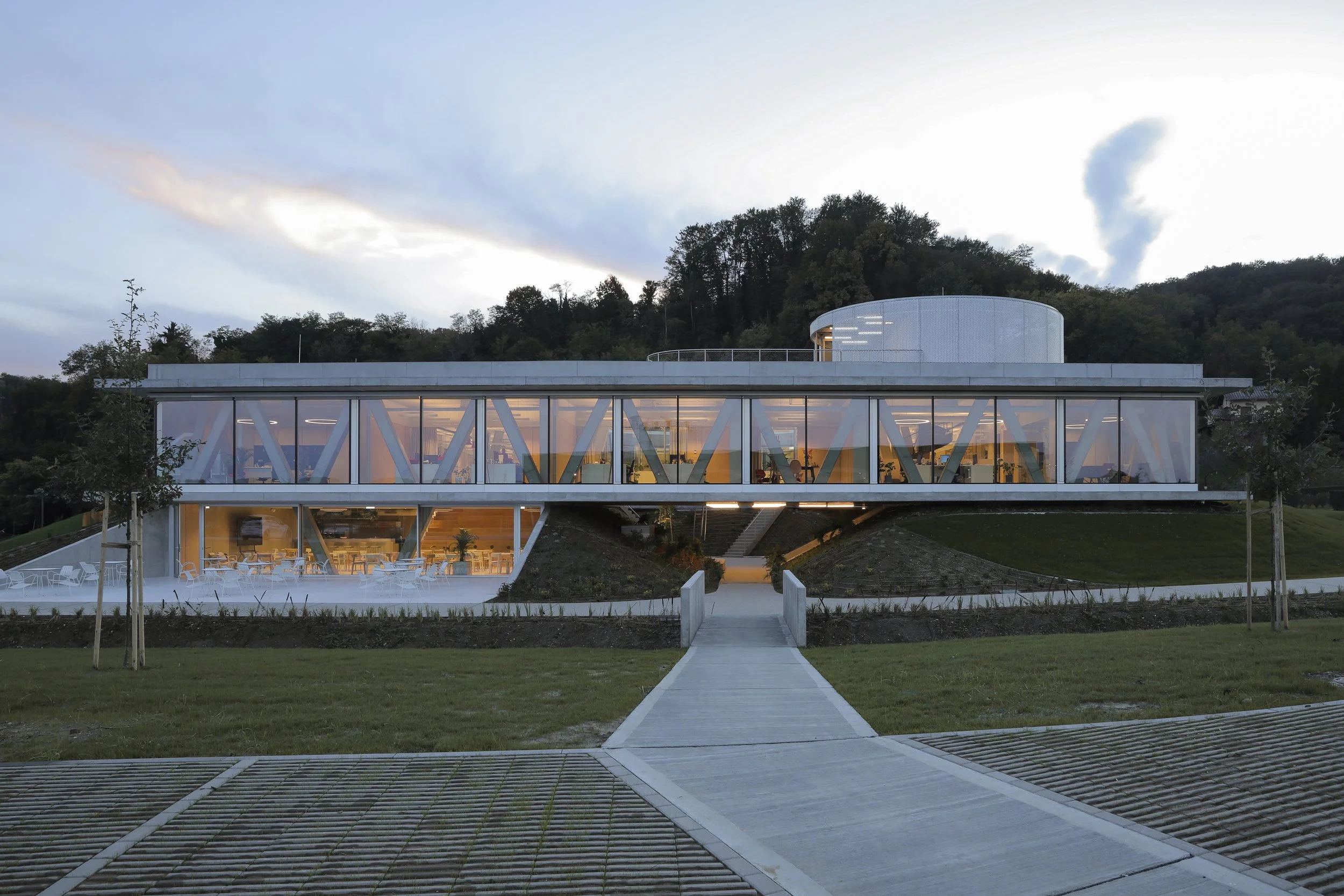 The production and business building is located in Dubrovčan, a town northwest of Zagreb characterized by a rural and natural landscape. Nestled in an area rapidly transforming into a small commercial and industrial complex, the site was previously used as a construction material storage yard in a derelict state.