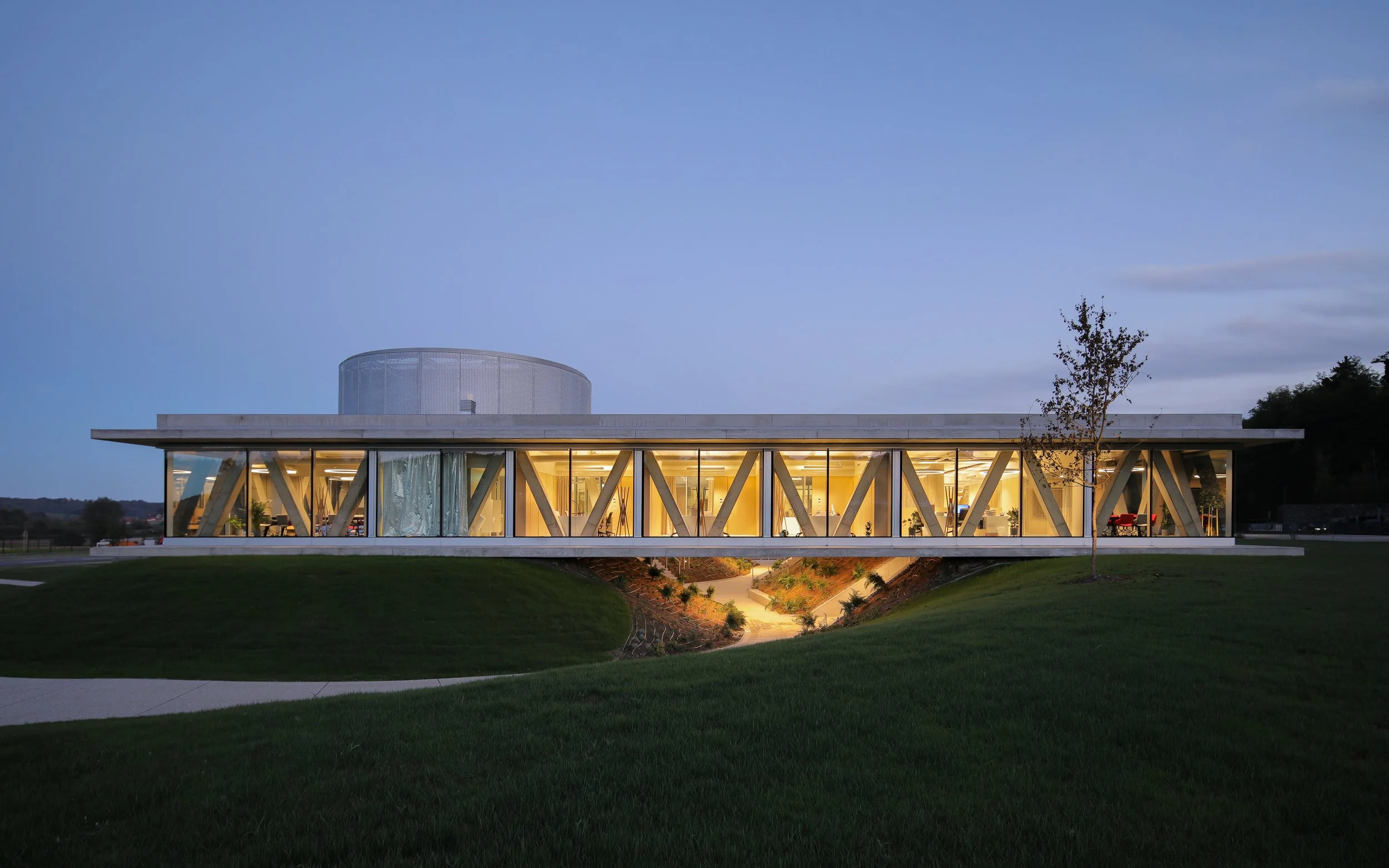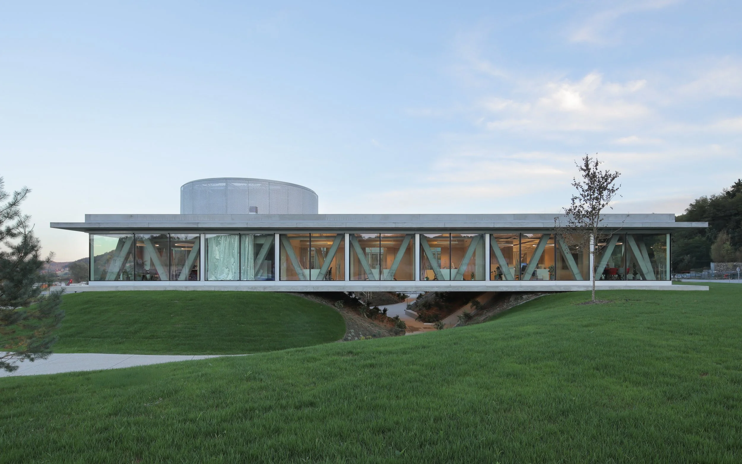 A horizontal volume is anchored within this dynamic context. A simple rectangular single-story structure, organized around a central circular atrium, is set atop three landscaped mounds. At once neutral and distinctive, the building draws the natural landscape into its interior, creating unexpected spatial sequences.
