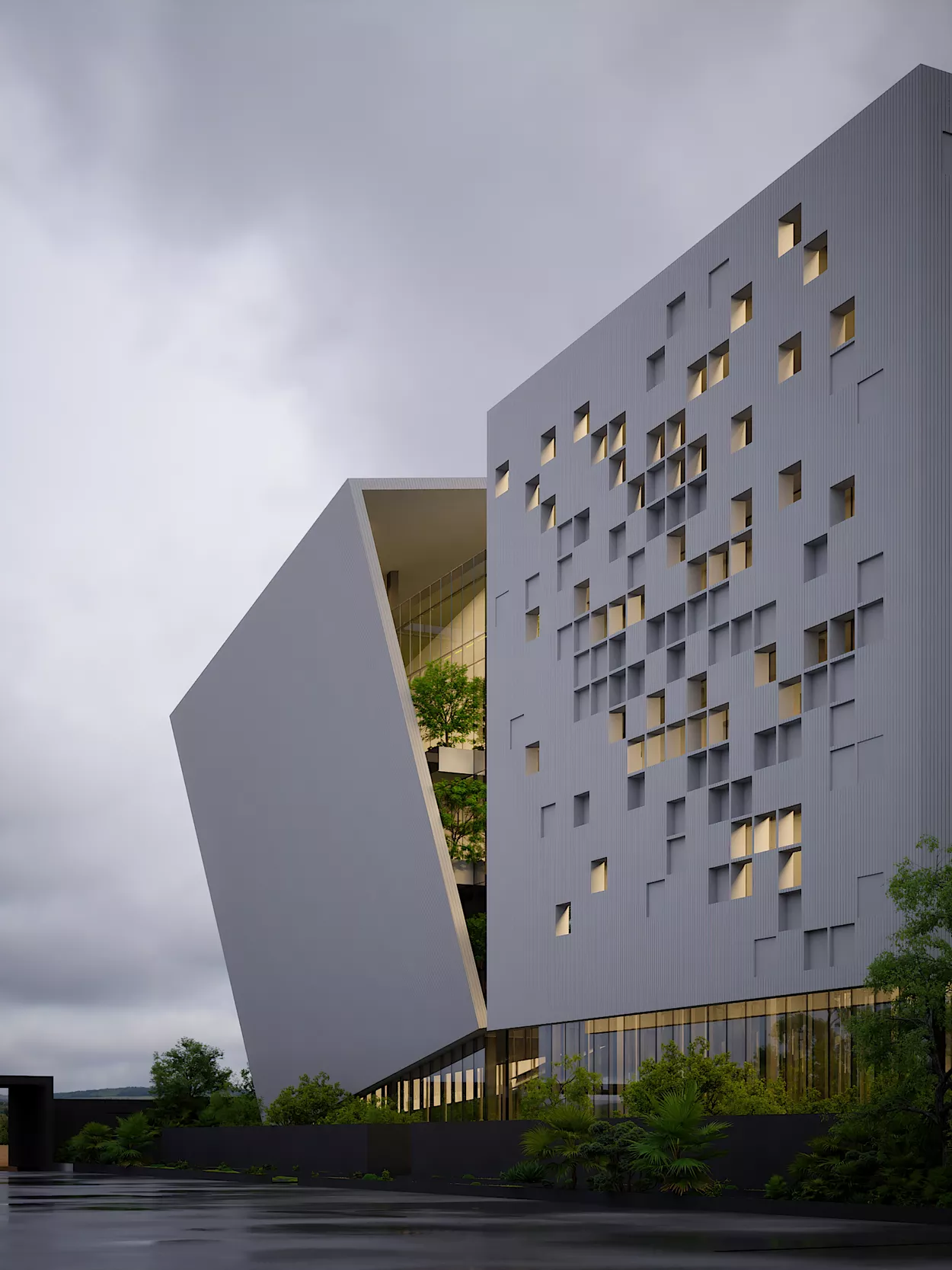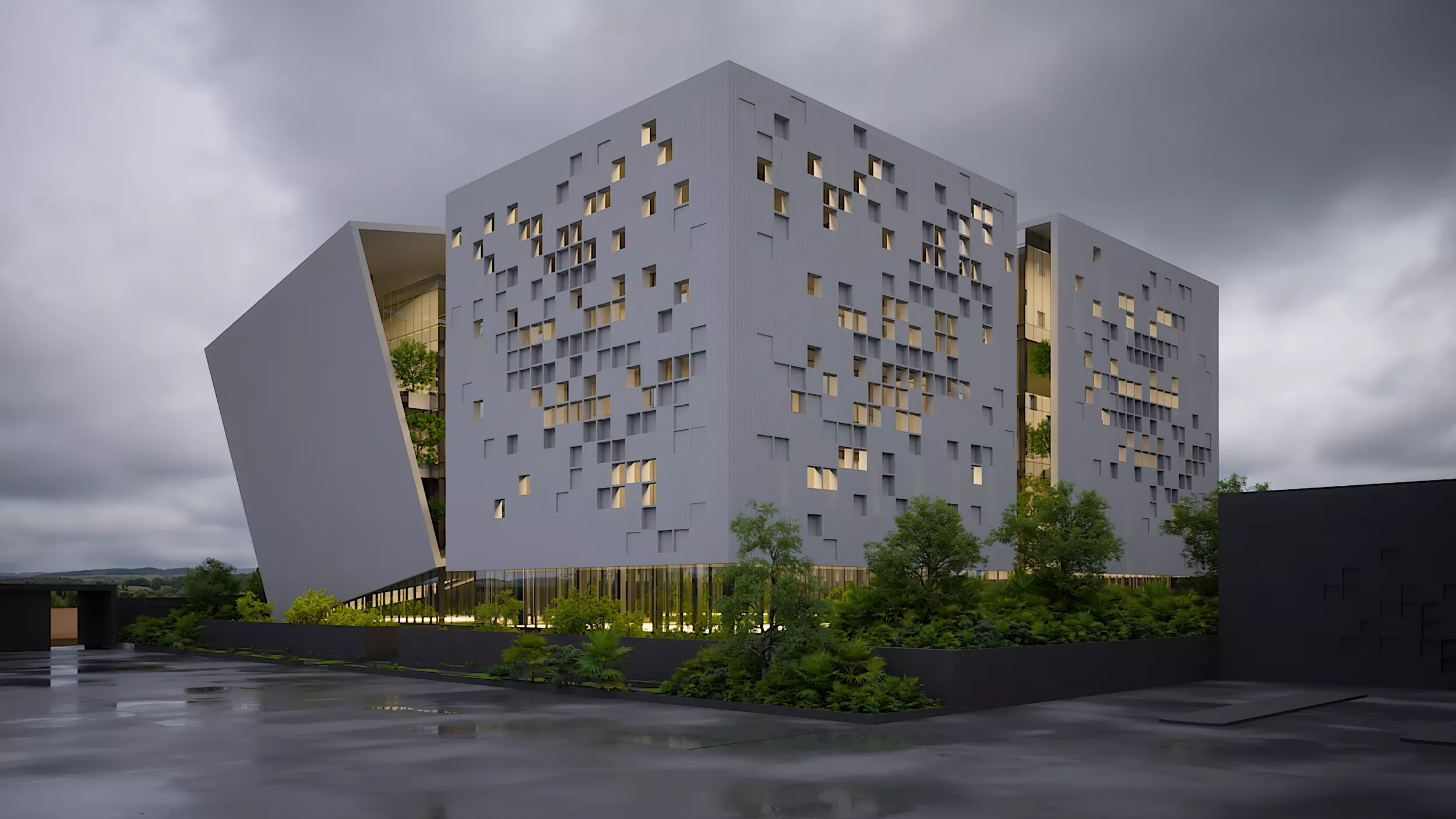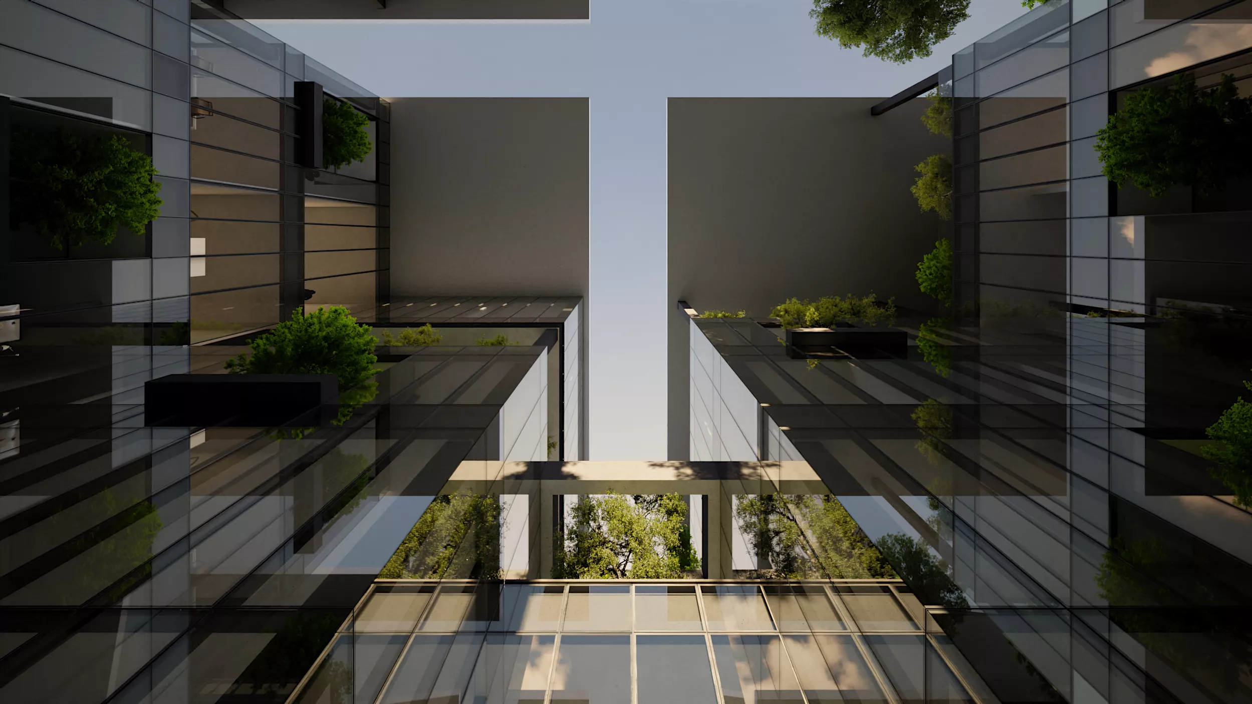 In designing, the office building retains all the features of the first idea but adopts a more extroverted approach. The external shell was removed, resulting in a design that feels more open and connected to its surroundings. The absence of the shell allows a heightened sense of openness and blends with the exterior environment, promoting a more connected and approachable atmosphere.