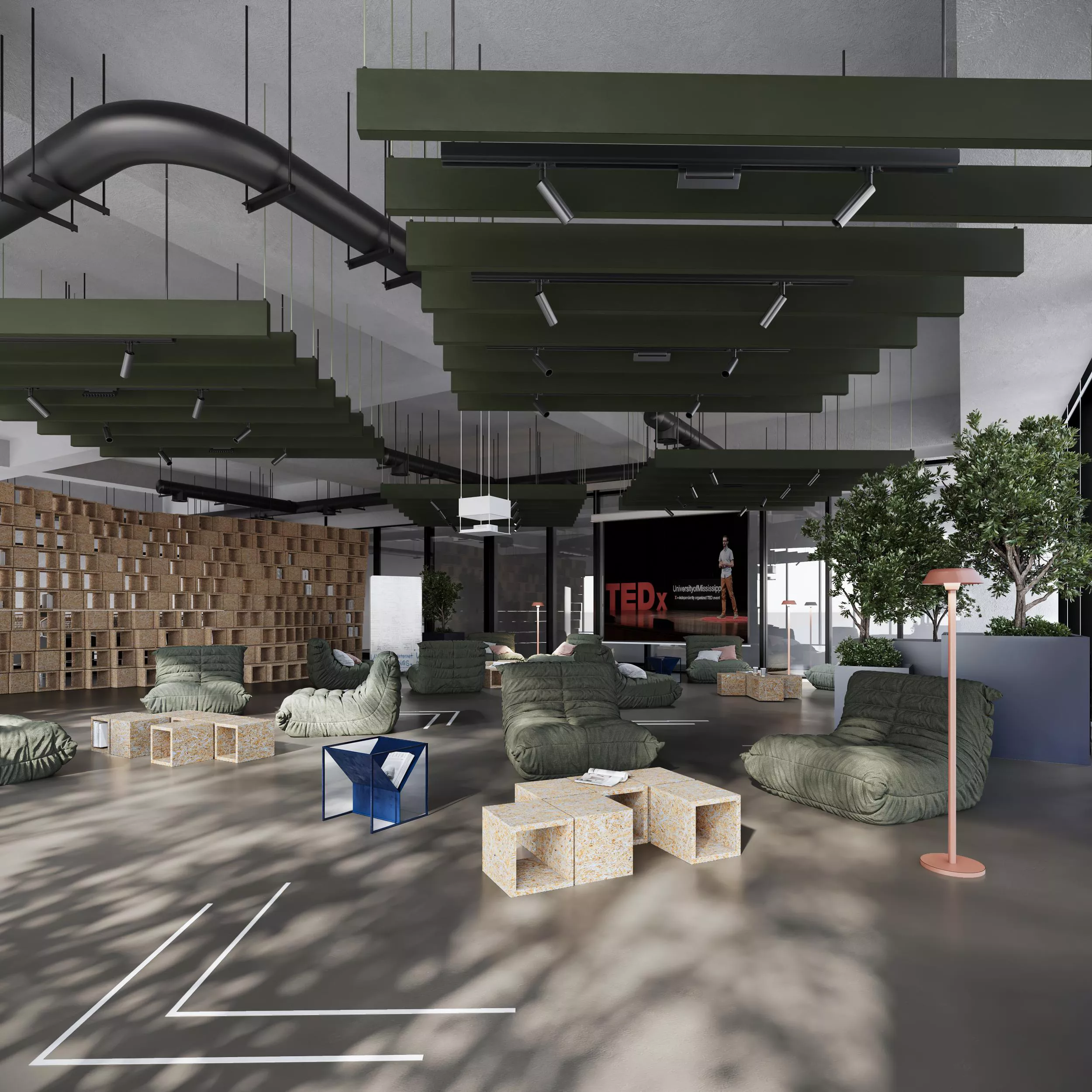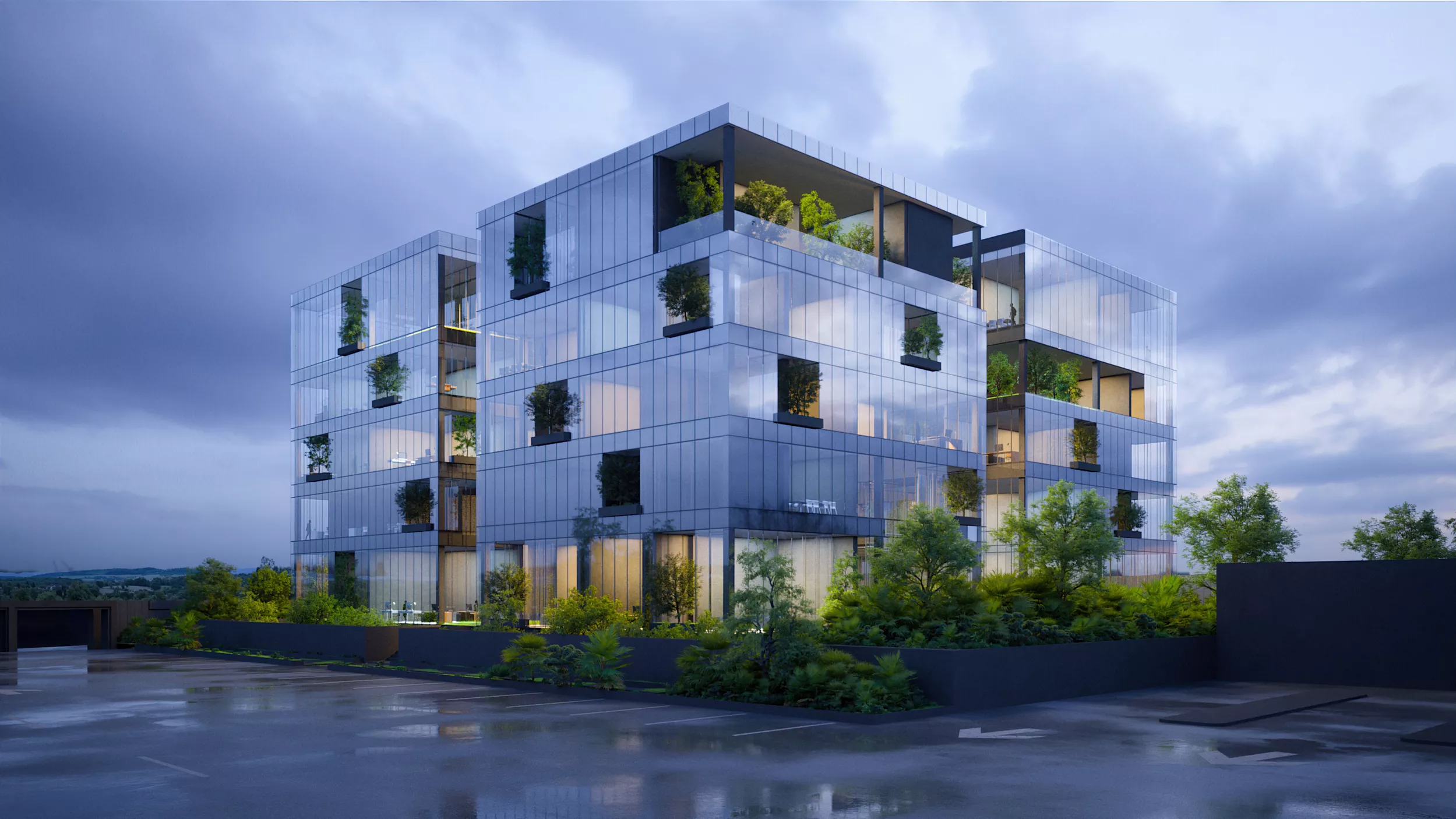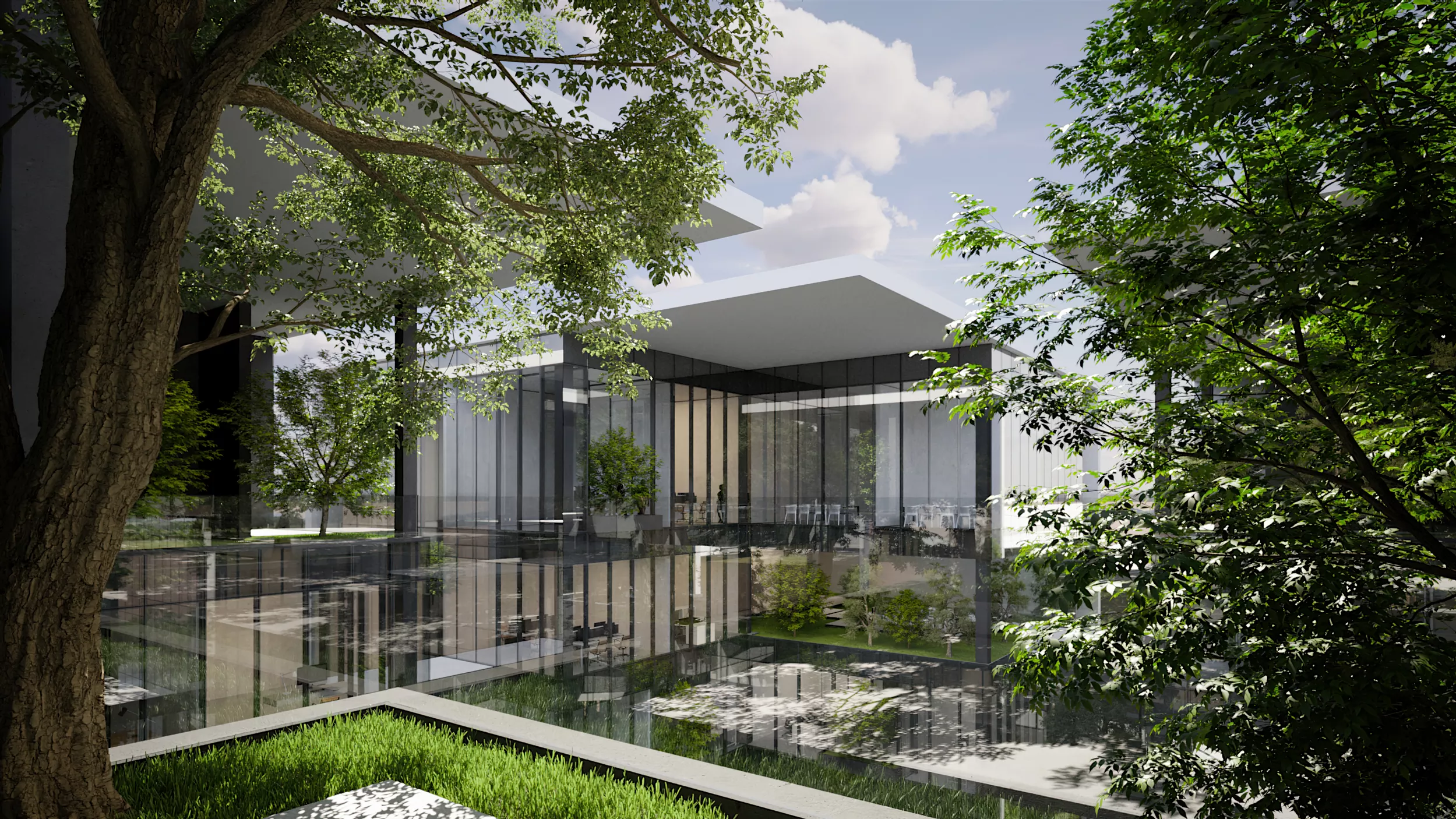 In designing, the office building retains all the features of the first idea but adopts a more extroverted approach. The external shell was removed, resulting in a design that feels more open and connected to its surroundings. The absence of the shell allows a heightened sense of openness and blends with the exterior environment, promoting a more connected and approachable atmosphere.