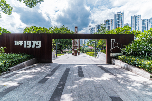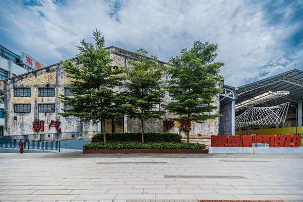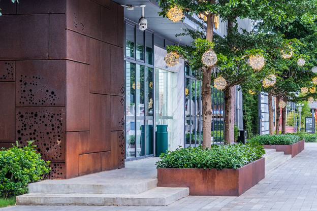整体的植物设计也借鉴了岭南园林的种植手法。园区现状的古榕树,我们都保留下来并进行悉心的修剪,也保留了现场的大部分植被。500多棵现有的各种条件的树木都被保留下来,让人们从园区开放的第一天就可以享受到大树的阴影、植物的芬芳和花朵的绽放。景观不但带来了商业氛围,还强调了生态元素。耐候钢被用作树池、长凳、景墙、标识、雕塑等等,与周边的工业建筑风格相呼应。