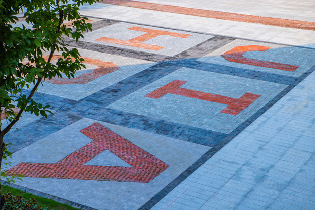 艺术街区是整个项目的核心区域,以重点构筑物和大乔木为中心发散出同心圆铺装系统,用大量的回收红砖和少量的火山石铺砌而成。筒仓广场前使用红砖和瓦片等材料铺砌大型的JIANYUZHOU拼音图案,成为鸟瞰园区的一个亮点。