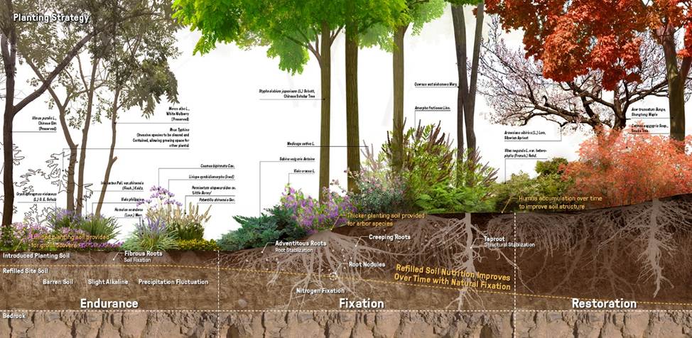 The landscape design utilizes diverse plant communities that blend natural and artificial elements, providing multiple benefits such as slope stabilization, soil enhancement, and aesthetic improvement. These plantings serve both as a foundation for ecological succession and recreational green spaces. Through their growth, they gradually incorporate the site's industrial heritage, preserving history through renewed vitality.
