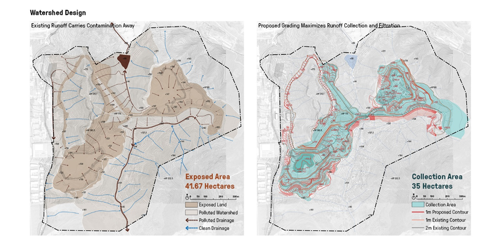 矿山修复前,场地现状土壤层瘠薄、土壤碱性、降水量变化较大,由于长期采矿,地表植被被破坏,土壤结构被改变,开采过程中形成的矿坑、边坡和废弃物堆场等,改变了原有地形地貌,生态功能退化。经过SWA与北京市地质工程设计研究院及的通力合作,编制了矿山地质环境保护与土地复垦方案。修复工作已于2023年5月完成,矿山生态修复投资2亿余元。