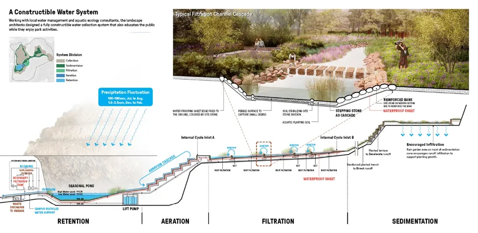 Located in the mountainous northern Beijing region, the park faces challenges such as summer rainstorms and winter drought. Through the implementation of an ecological sponge system, the project successfully withstood the extreme rainstorm event in Beijing on July 31, 2023. Measures such as reinforced grass swales and rain gardens effectively intercepted and channeled rainwater from the slopes. Additionally, resilient native plant species were applied to withstand extreme weather conditions and improve soil fertility.