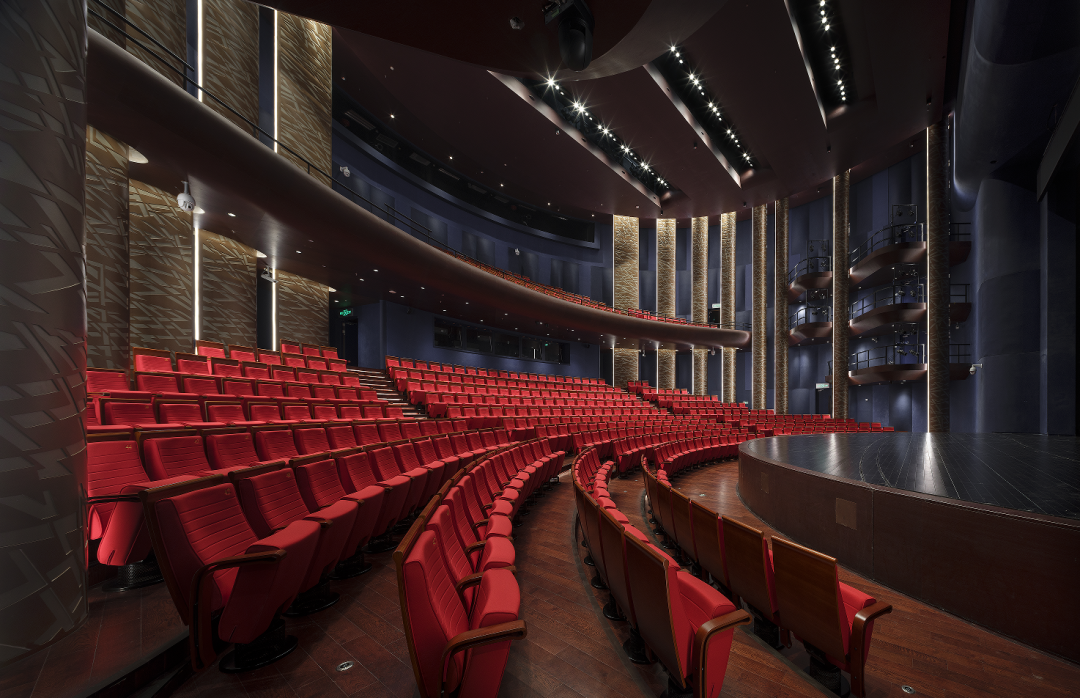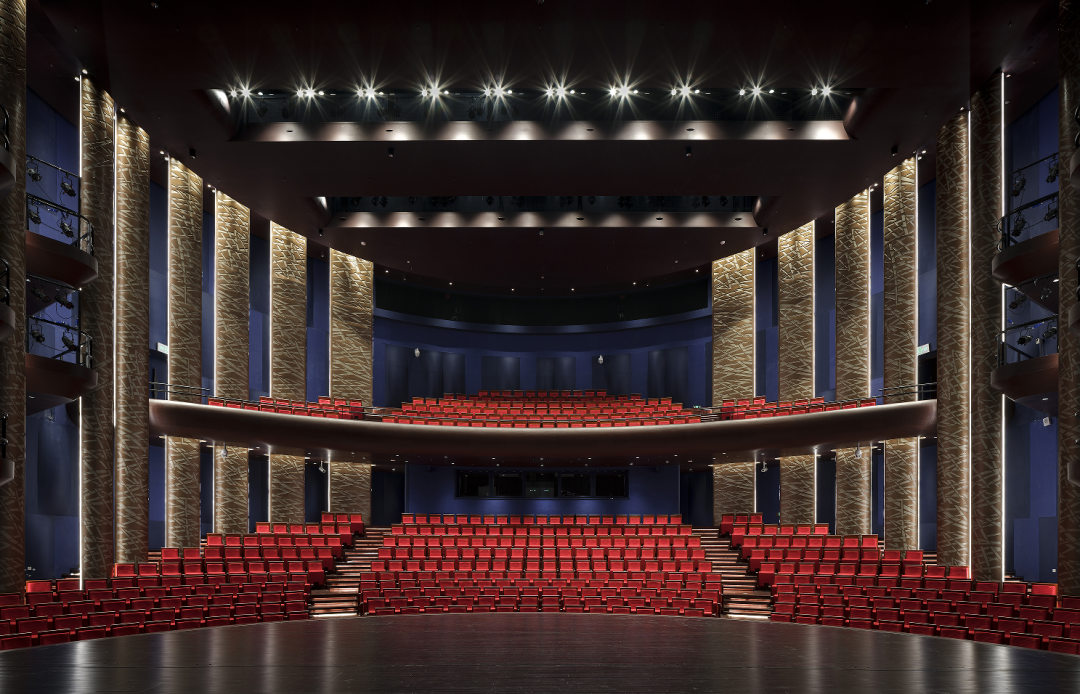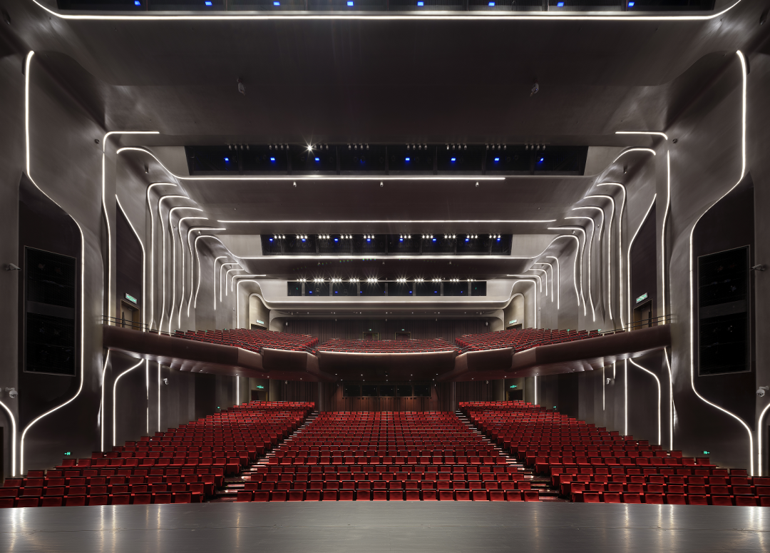 正如南通这座四通八达的城市所具有的不同群体间的多元与包容一样,南通大剧院的五座大厅因其不同的功能需求,也体现出不同层面的在地性与亲和性的诠释。大厅内的室内装饰材料的风格独立而富有个性,然而,从技术的视角审视,这五个剧场展现出了高度的统一性。它们均采用了表面带有精致凹凸纹理的玻璃纤维增强石膏板(GRG)作为墙面材料,这一设计旨在最大限度地优化声学效果。此外,舞台灯光、音响、机械的设计,无一不体现出对现代化表演与观演体验的极致追求,旨在为观众与演员共同营造一个前沿而沉浸式的艺术空间。