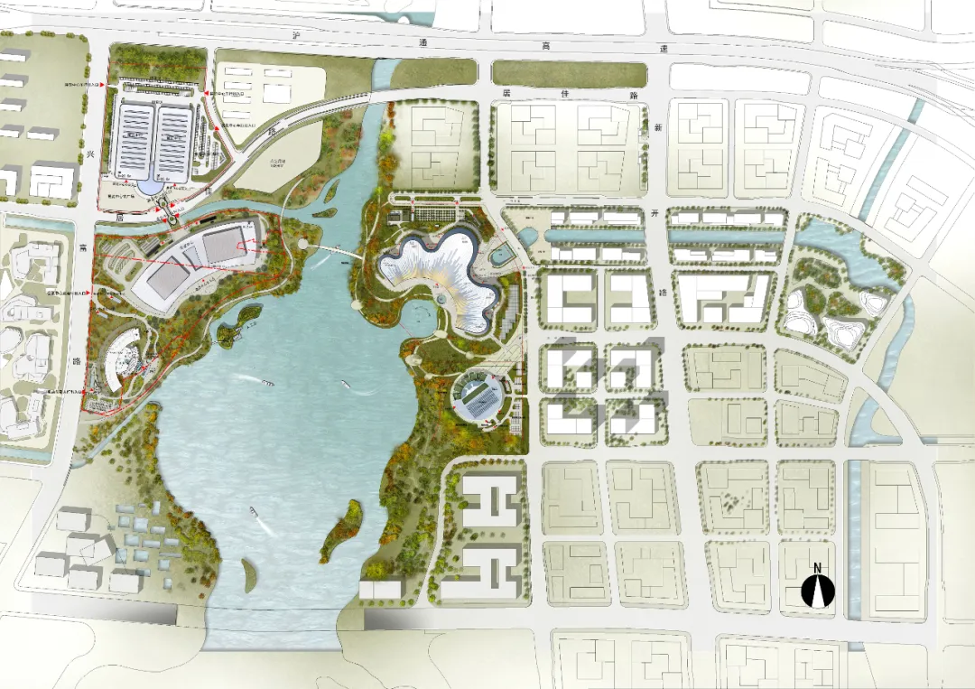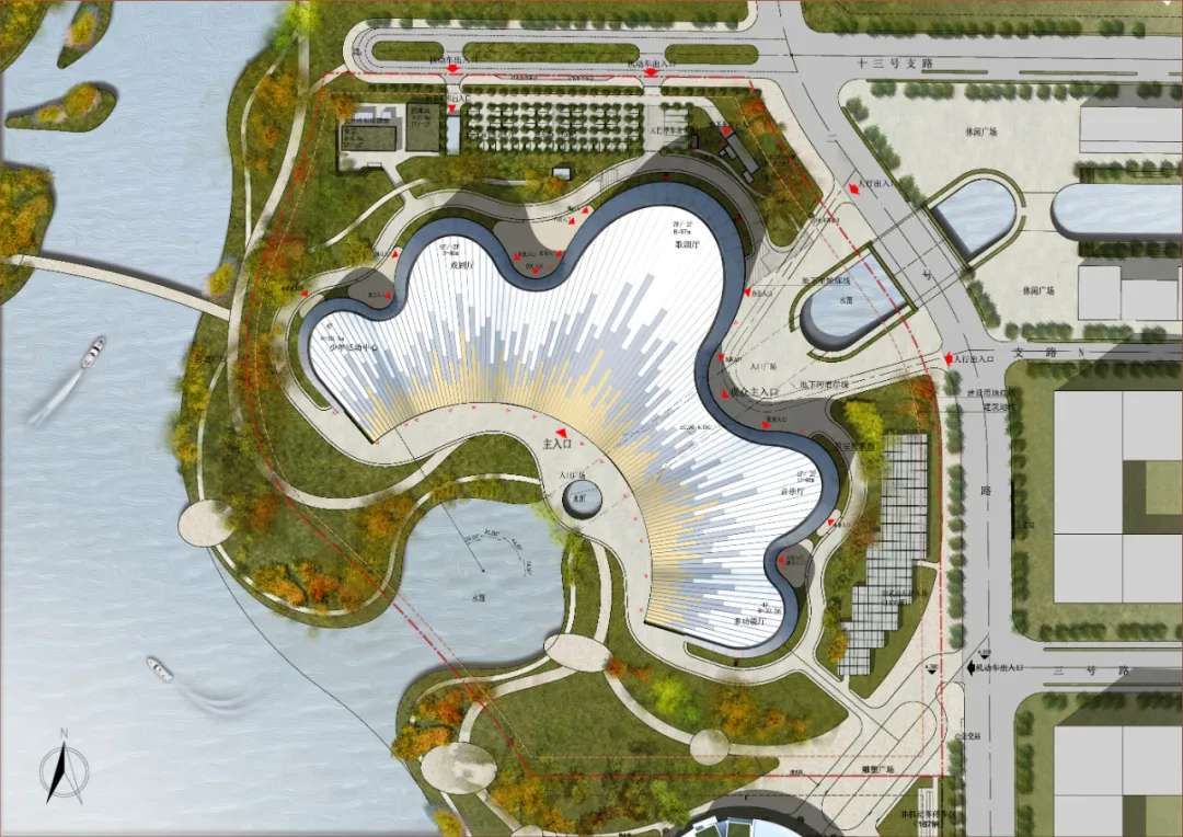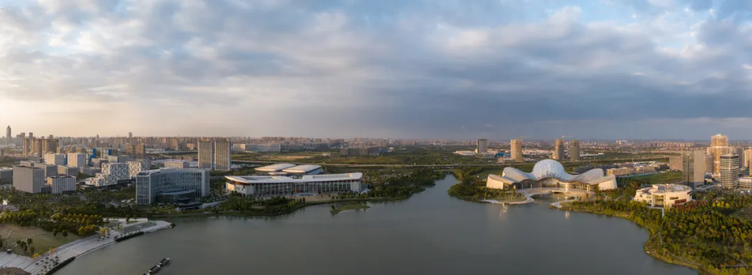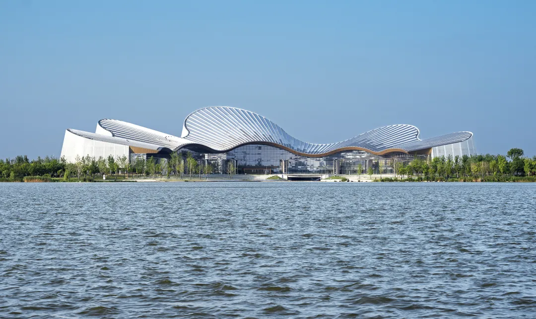 南通古称“通州”,以其“地据江海之会,通达吴越之路”而得名。可以说,南通大剧院所处的水域与城市边界空间是这座城市地理位置与历史信息的缩影。大剧院位于南通市崇川区紫琅湖东北岸,与南侧的南通美术馆和西侧的南通国际会展中心共同构成南通中央创新区的文化会展核心区。南通中央创新区三大公共建筑的组合在紫琅湖畔打造了一片对市民开放的公共空间。这是对水域与城市边界的消隐,是对城市空间组织形式的再定义,更是这个区域在地性与亲和性特征的基本姿态和自我定位。
