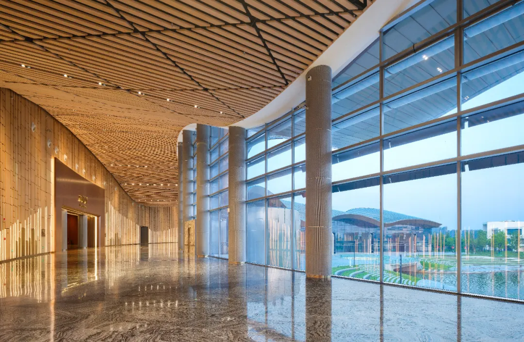 紫琅湖水也作为重要空间元素被引入室内。顶面为艺术化的不锈钢水波纹吊顶。同时,在紫琅湖与运河间穿梭的游船可通过大厅中央的圆形玻璃地面,窥视到大剧院内精致的室内空间。吊顶和地面、室内和室外,形成了多重的视觉和艺术互动,精彩纷呈。这个充满惊喜的设计是大剧院空间连贯性的保障,更是对建筑在地性与亲和性的巧妙诠释——无论剧院开放与否,建筑在视觉感知层面,永远是城市公共空间的延续,以公众体验及参与为第一性。