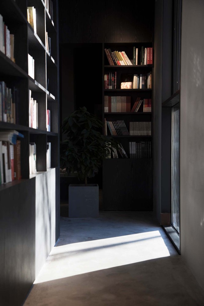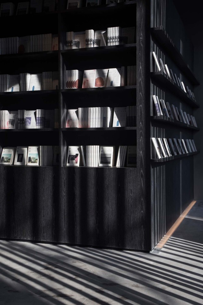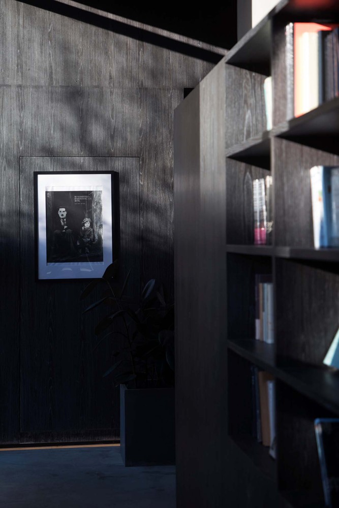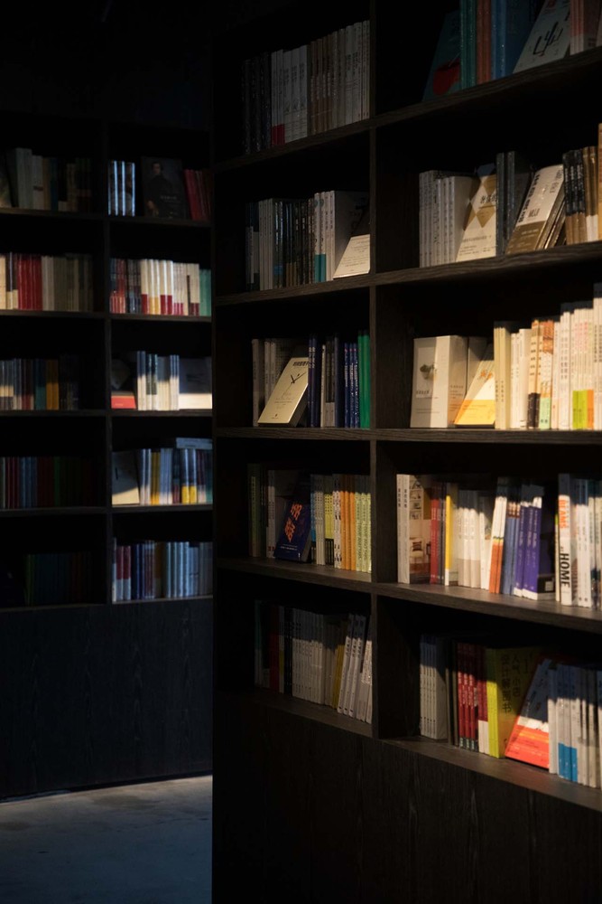 设计对于空间的想象,最初源于“孤独”。当人们远离城市的暄嚣,独自身处海边,面对自己,孤独感瞬间被成倍放大了。与传统书店不同的是,设计企图创造一个以人为单元的互动空间。在原有梁柱结构不变的前提下,采用“包裹”和“消解”的方法,将不同功能的深灰色木质的盒子穿插其中。这些形态大小不一的“盒子”赋予原本单一的空间更丰富的延展方式,令读者在随意游走中完成对空间的趣昧探索。既可以隐于一个人独处的小盒子,沉浸于一个人的冥想,也可以走入更开放的空间,遇到新的朋友产生交流和互动。这些“盒子”给了人们选择孤独的机会,也带来相聚的可能。