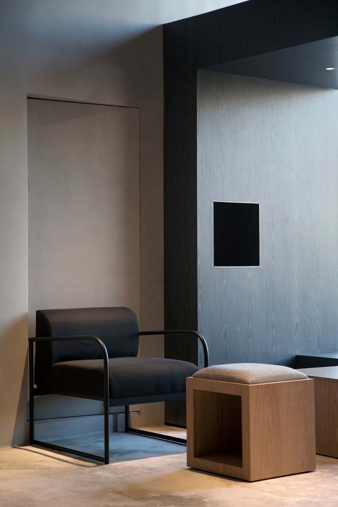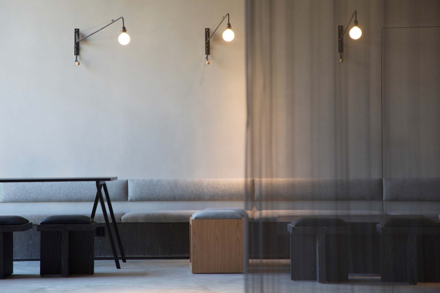 材料运用上,保留了原建筑混凝土的粗犷氛围,搭配深灰色木皮,原色钢板与水磨石等自然朴素的材料,营造出独特的,属于海边书店的独立冷静的氛围。