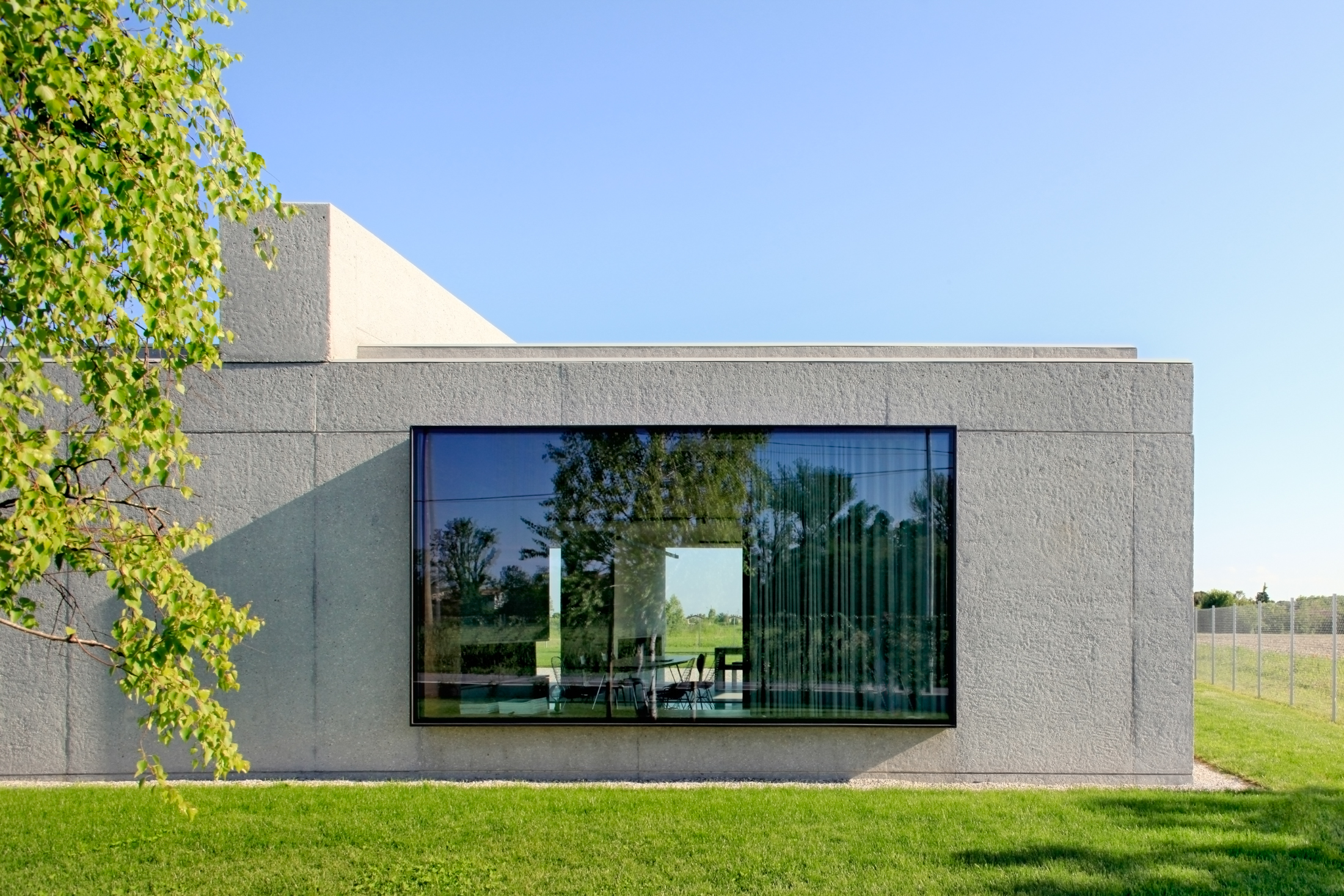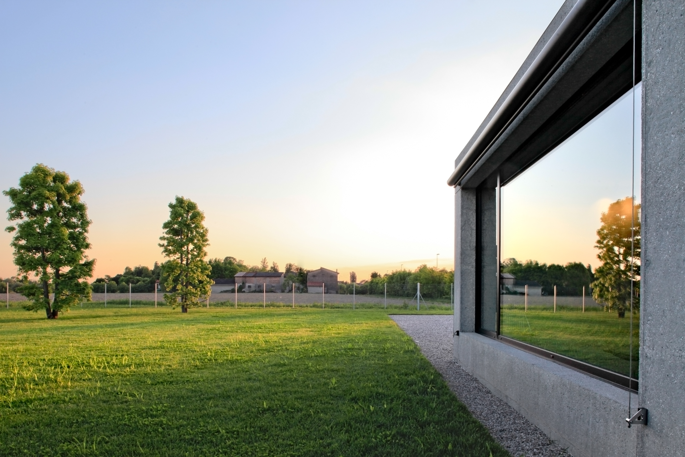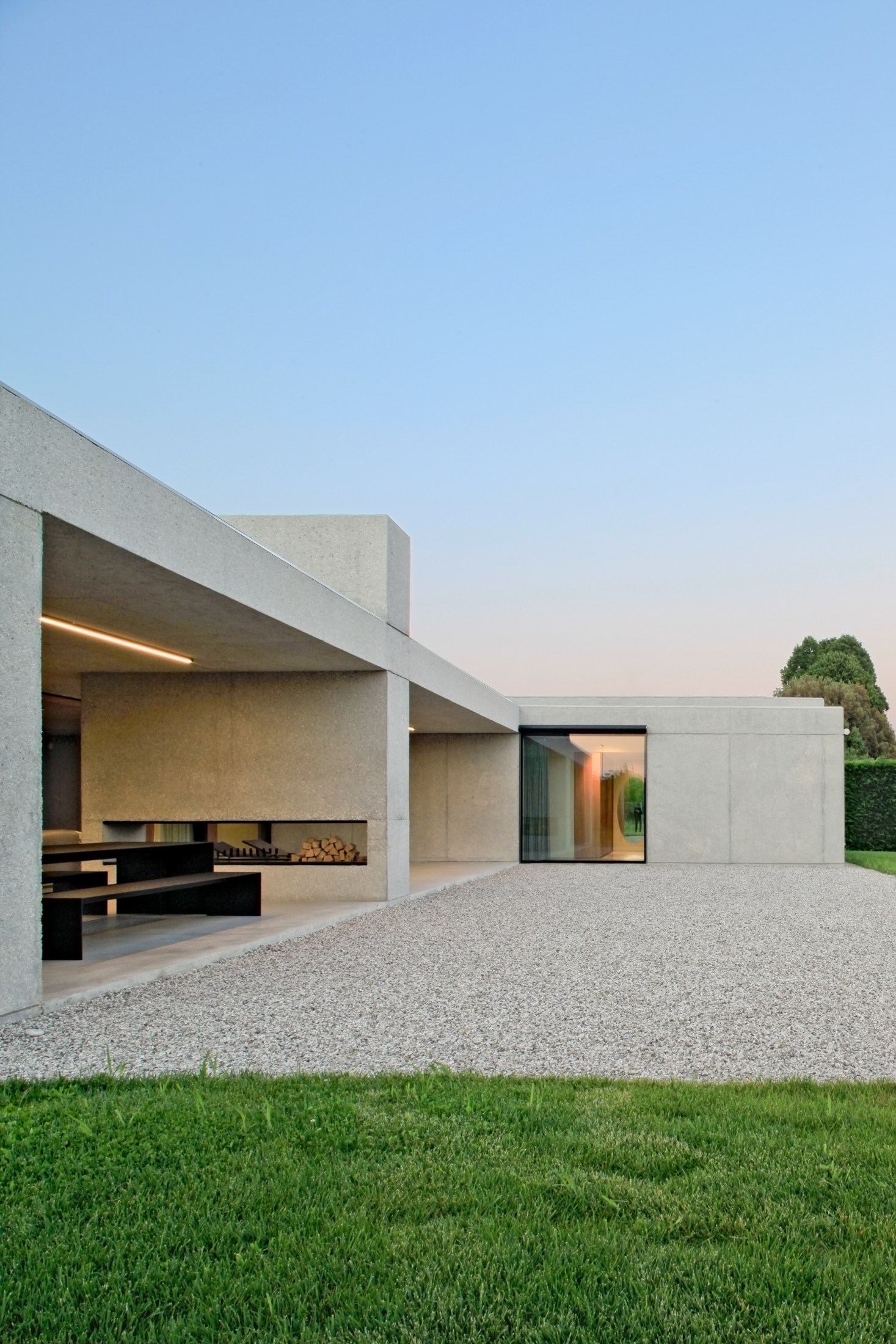 The shape of the house is generated by the union between the functional layout of the interiors and their best exposure creating two outdoor areas that are thus shaped with two different purpose: the south area with large windows facing the countryside and a portico and the area facing the north façade that is closed and impermeable towards the road.