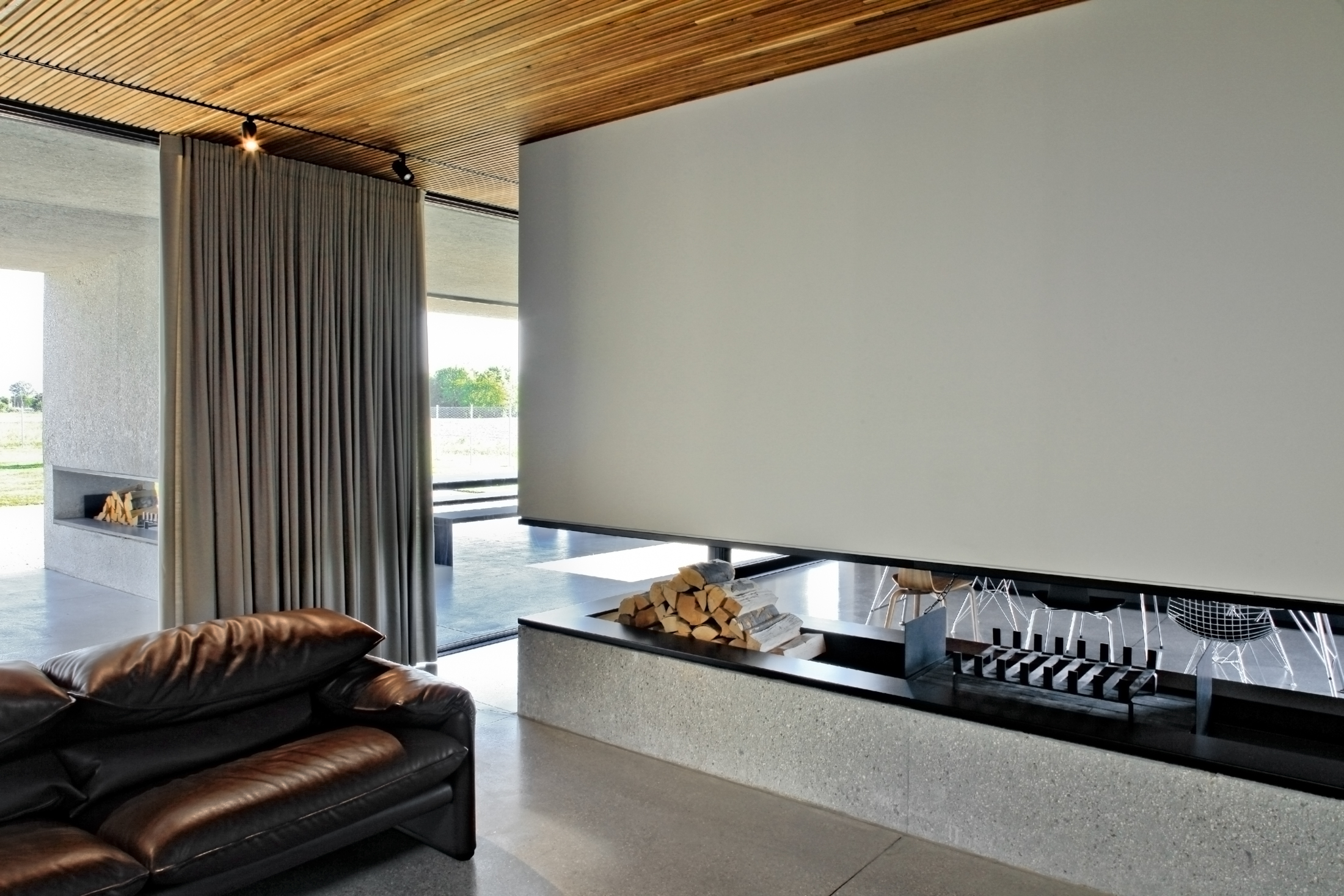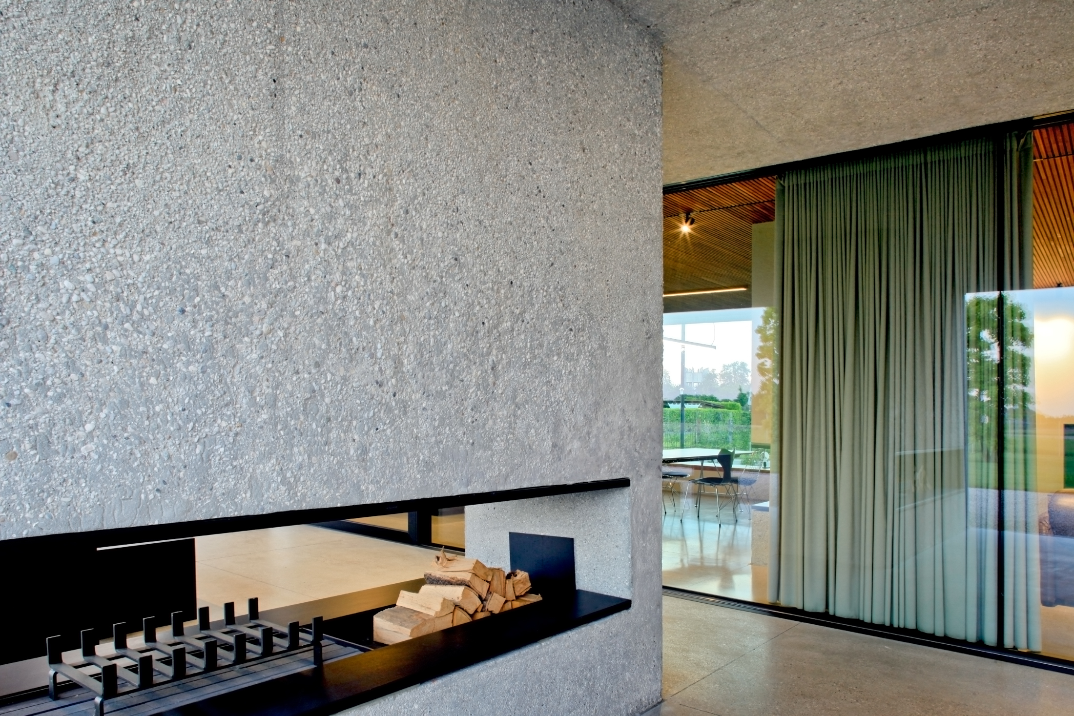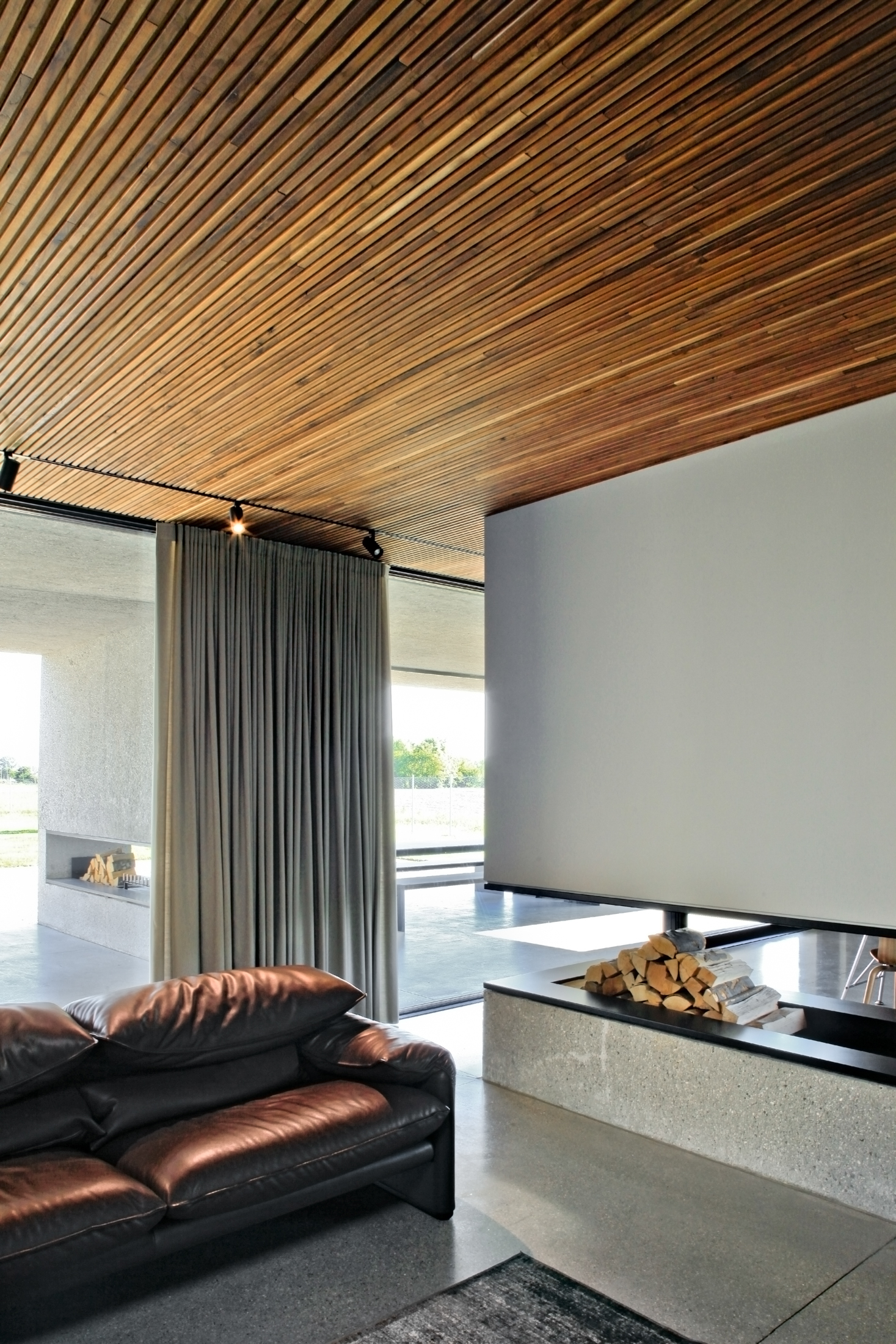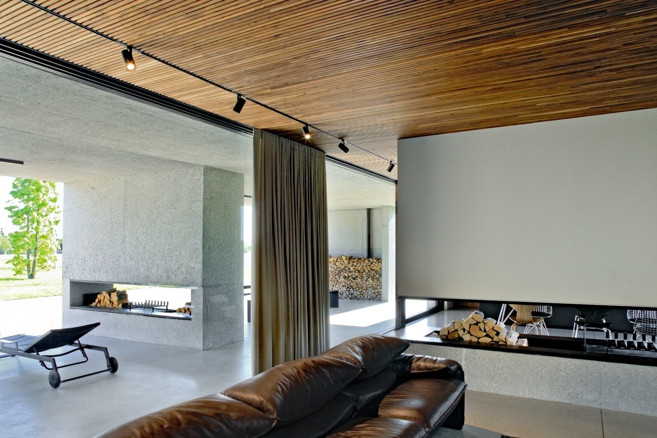 The shape of the house is generated by the union between the functional layout of the interiors and their best exposure creating two outdoor areas that are thus shaped with two different purpose: the south area with large windows facing the countryside and a portico and the area facing the north façade that is closed and impermeable towards the road.